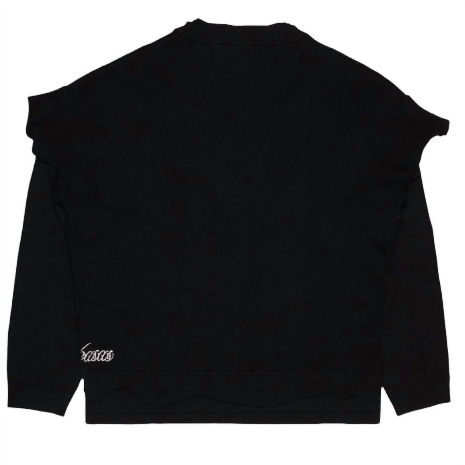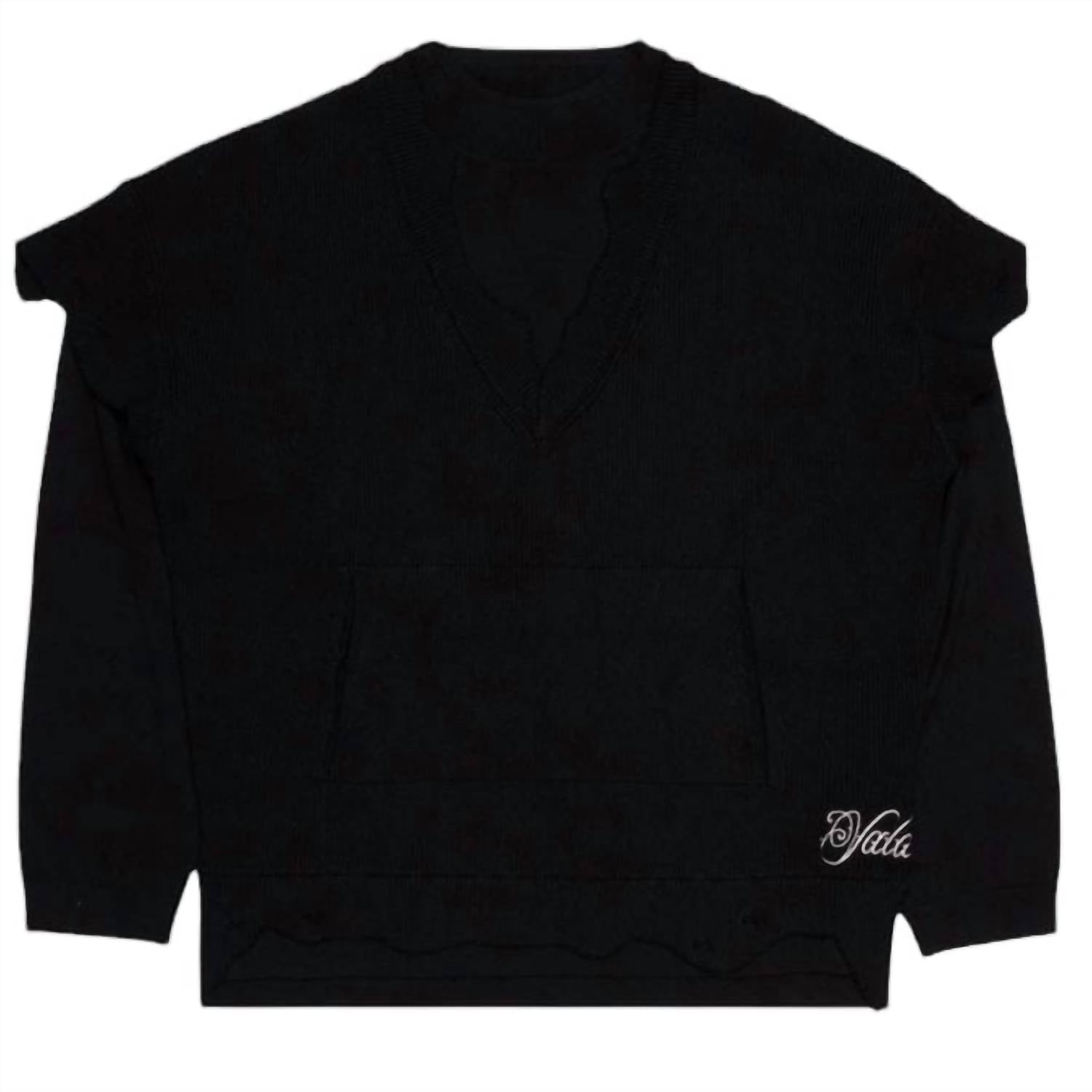 The ultimate go-to sweater, expertly crafted to provide the perfect combination of warmth and style. Its classic design and soft fabric make it a must-have addition to your wardrobe. Introducing the Men's What Crewneck Sweater by VALABASAS, a statement piece that seamlessly blends bold style with comfort. This long-sleeve sweater in textured black features a layered V-neck design and raw-edge details, encapsulating a deconstructed, avant-garde aesthetic. Made from premium knit fabric, it offers warmth and functionality with a front kangaroo pocket. Closure: Pull-on. Care: Machine wash cold with similar colors on a gentle cycle; lay flat to dry and iron on low heat if needed.