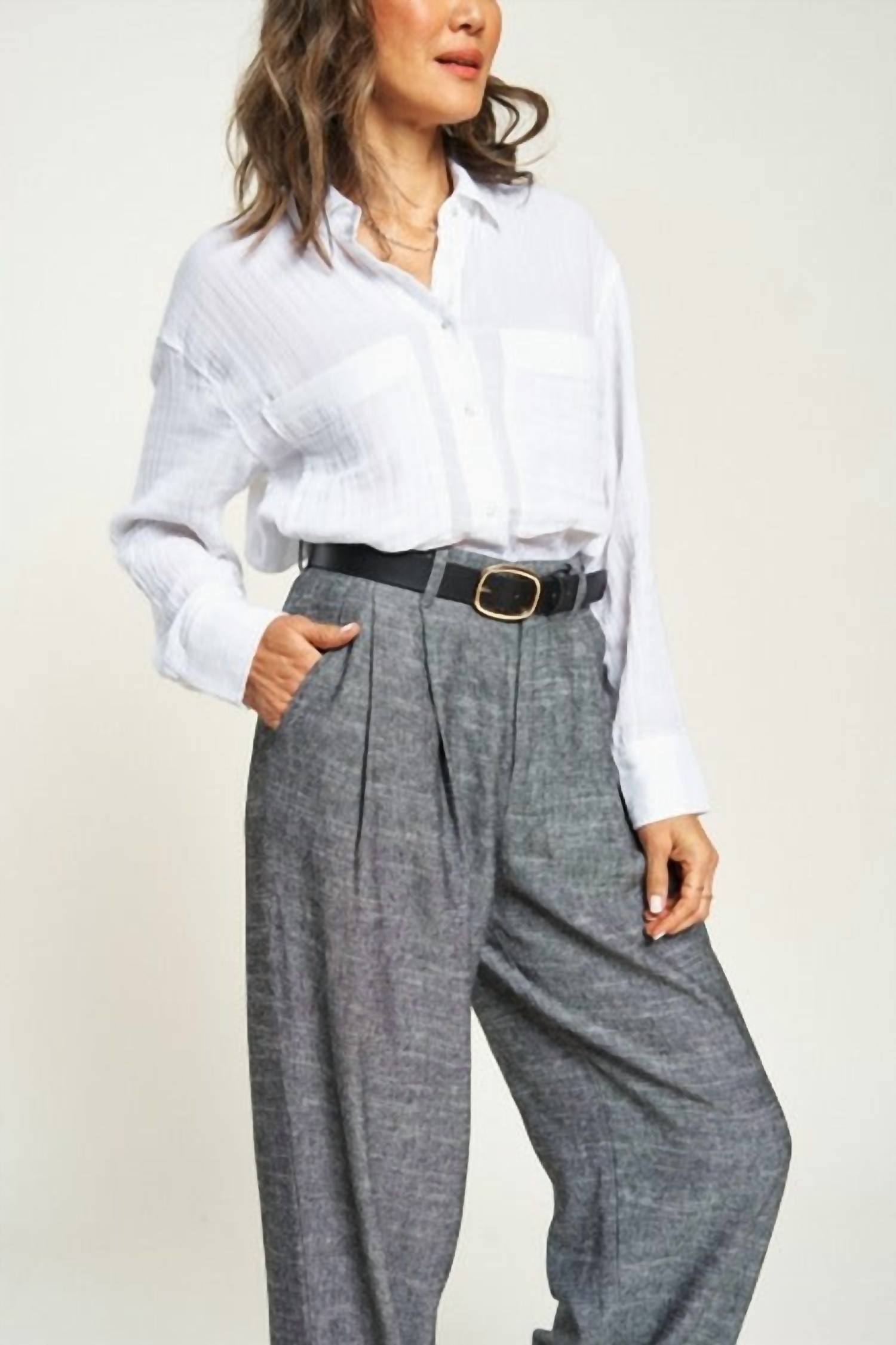 Elevate your wardrobe with the Evanston Linen Blend Trouser by Oliver Logan, offering an upscale look with a lounge-like feel in a Desert Storm color. Featuring a high rise, these wide-leg trousers are tailored through the hip and relaxed at the leg, complete with pleats, a button closure, and back pocket lining. Made from a light linen blend, the fabric is 100% cotton, ensuring cool and easy wear. Closure: Button closure. Care: Dry clean. These trousers boast a 13.5” rise, 17 ¼” back rise, and 32” inseam, making them a chic addition to any summer workwear collection.