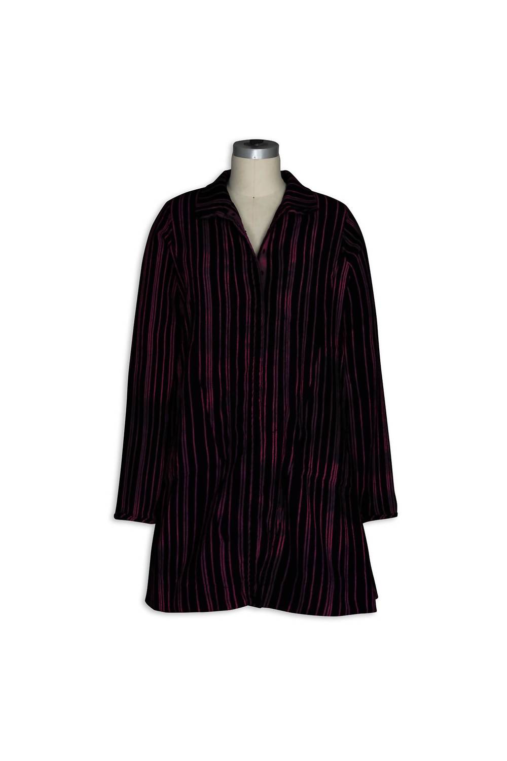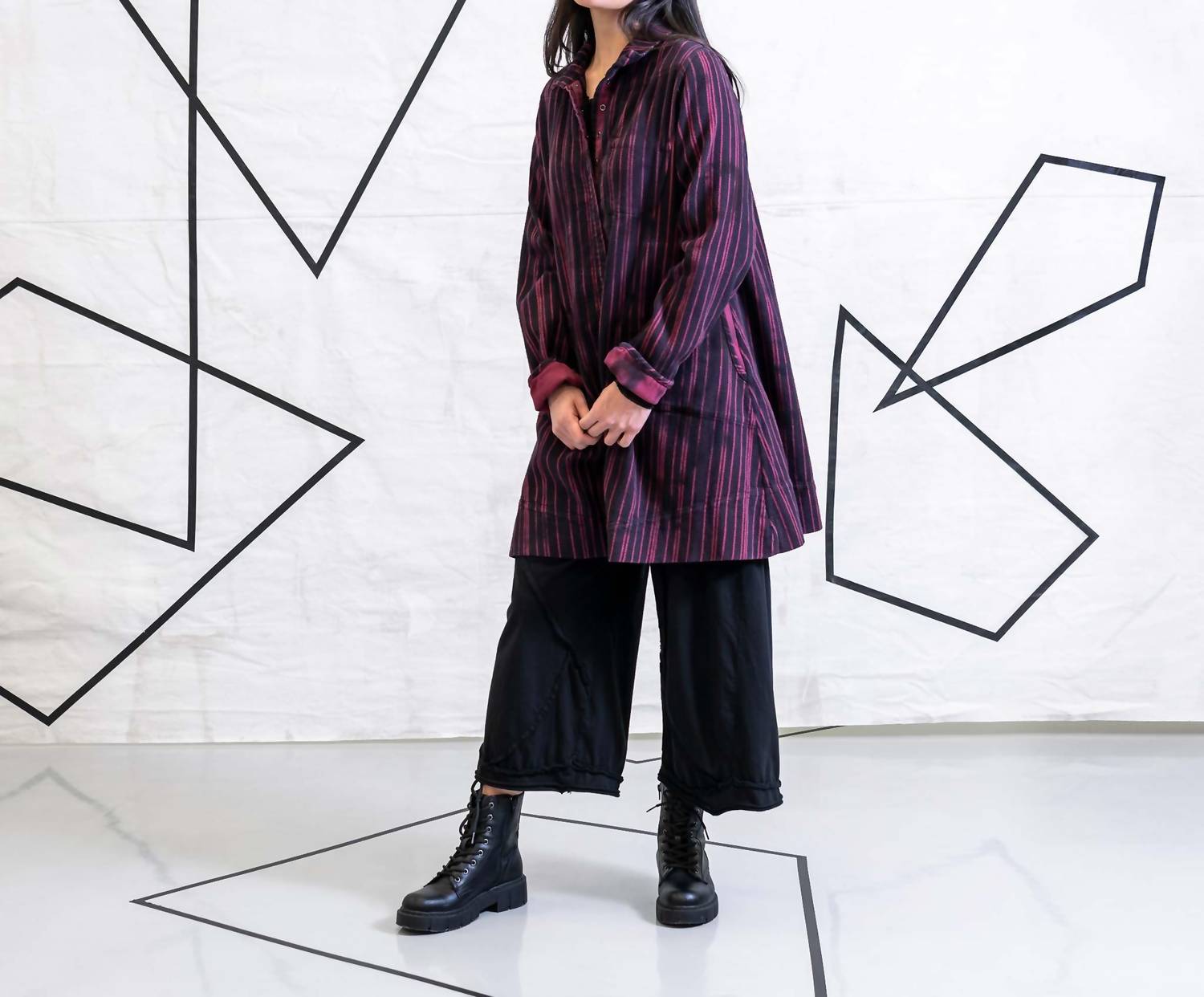 This Abacus Reversible Jacket is made from 100% cotton and features a mandarin collar, concealed snap closure, and functional side pockets. It offers a striped pattern on one side and color-blocked sections on the other, perfect for versatile styling.