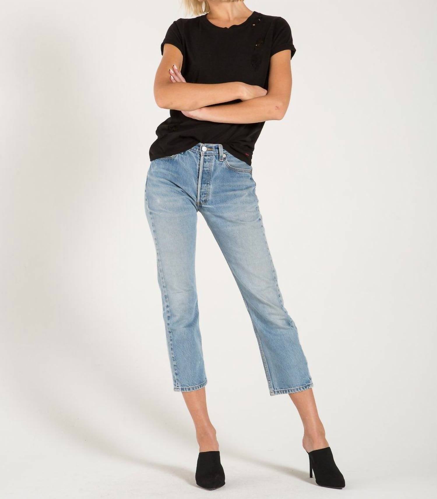 Relaxed fit crew neck tee with hand deconstructed holes on wearers’ left shoulder and hem. Hand sewn metal plaque on wearers’ left hem.Wash cold delicate, like colors. Lay flat to dry.Made in LAPlease note every garment is hand finished and may vary in look.
