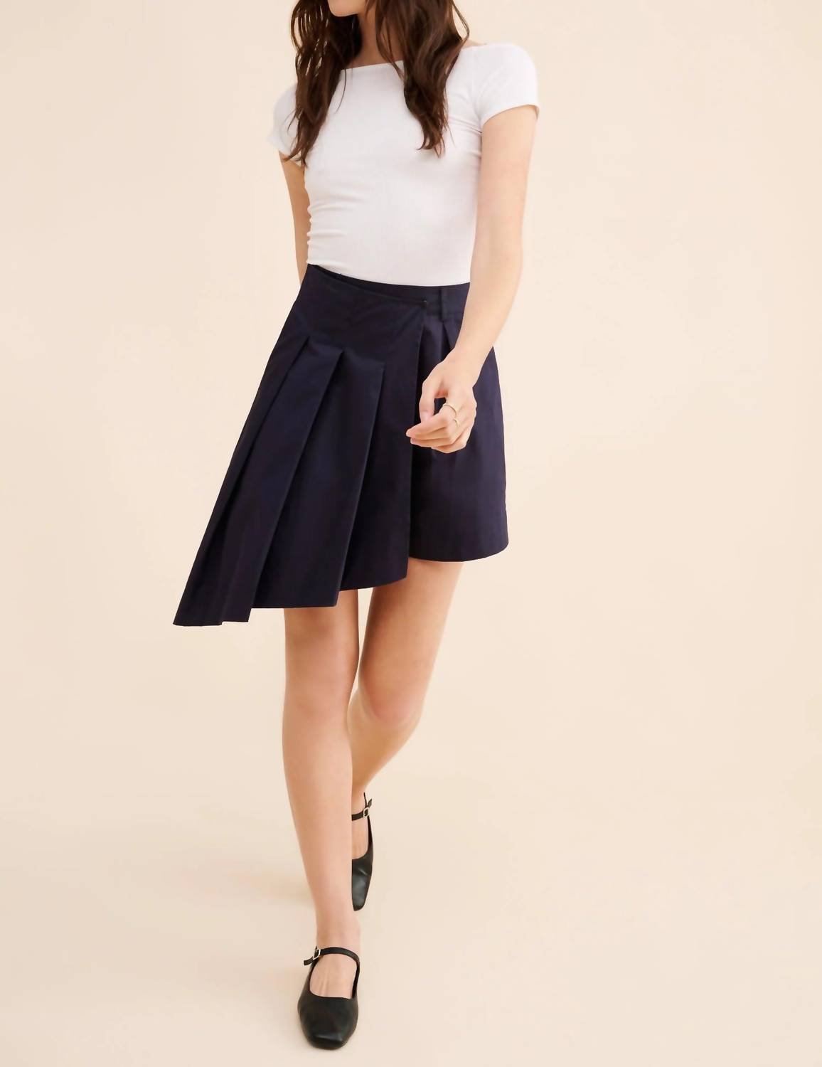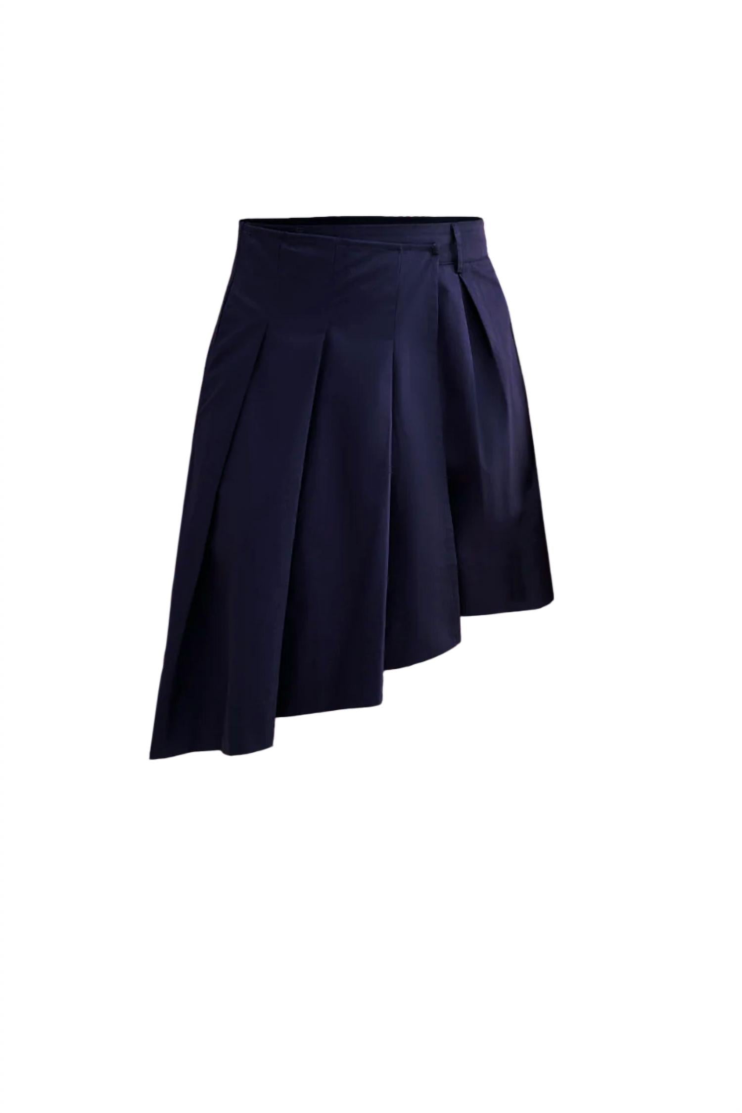 The go-anywhere and do-anything skort that you'll love to live in. Introducing the Navigator Skort by Allina Liu in a stunning Mariana hue, a chic addition to your minimalist wardrobe. This solid cotton twill skort features a unique asymmetrical pleated panel with a convenient snap closure, coupled with practical side seam pockets. Crafted from 100% imported cotton twill, the skort boasts an invisible back zipper and hook & eye closure, ensuring a sleek finish. For best care, gently hand wash and line dry, or opt for dry cleaning to maintain its pristine condition. Note: This style has no stretch and runs small, so consider sizing up if in doubt. Model Juliette is 5'11" and wears a size XXS.