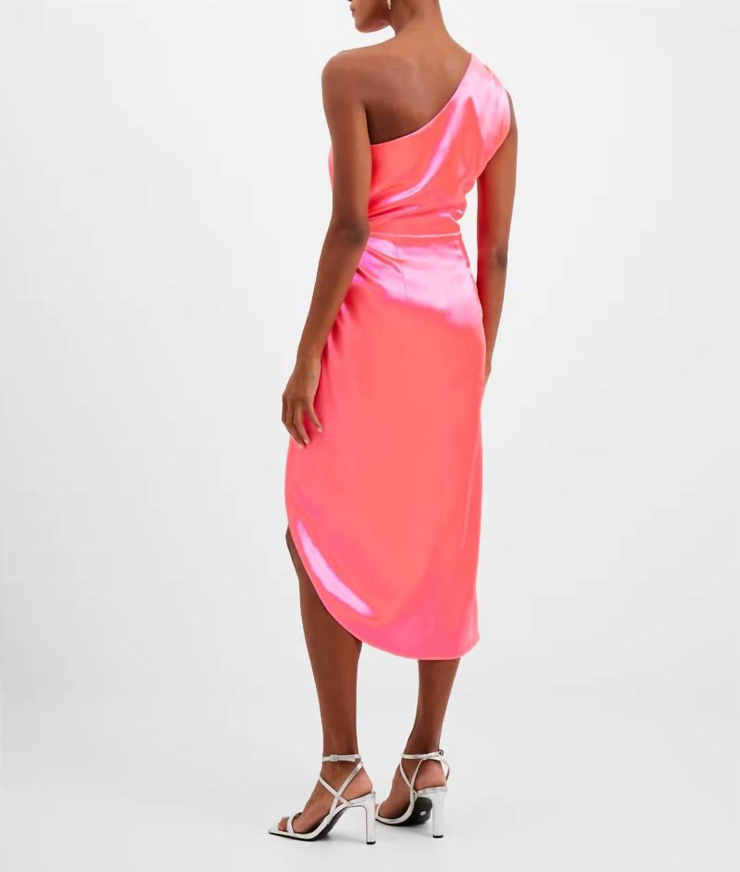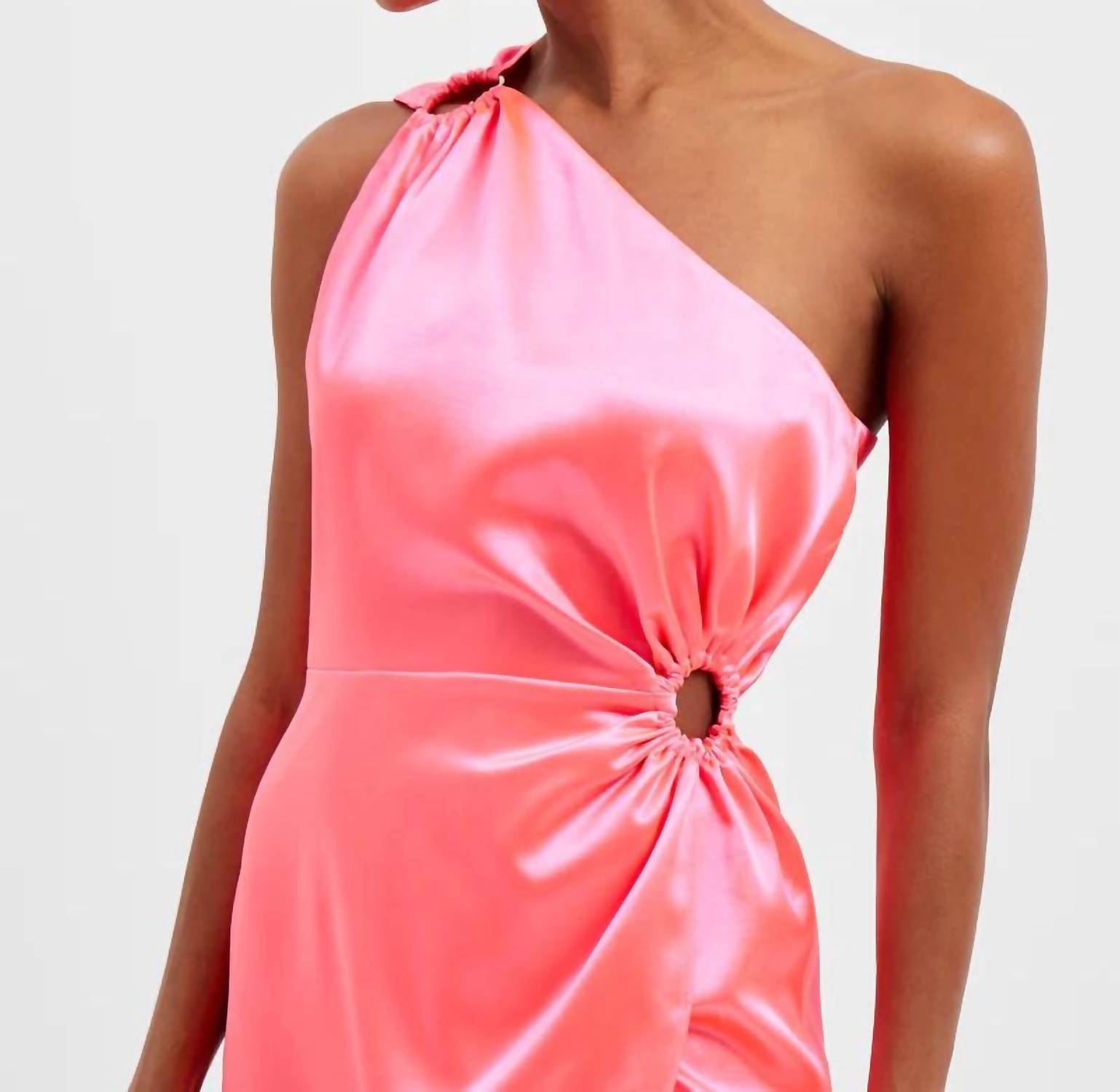 Looking for that perfect event dress? Look no further... Meet the Adaline One Shoulder Dress by FRENCH CONNECTION, a standout piece in vibrant neon rose perfect for a memorable occasion. This sleeveless dress, crafted from smooth satin polyester, boasts an alluring one shoulder design with a unique ring detail and falls to a flattering 36.42-inch length. The side zip closure eases the fit while the gathered waist with peekaboo ring cut-out adds a charming touch. Care is simple with a hand wash routine, making this dress as practical as it is stunning.