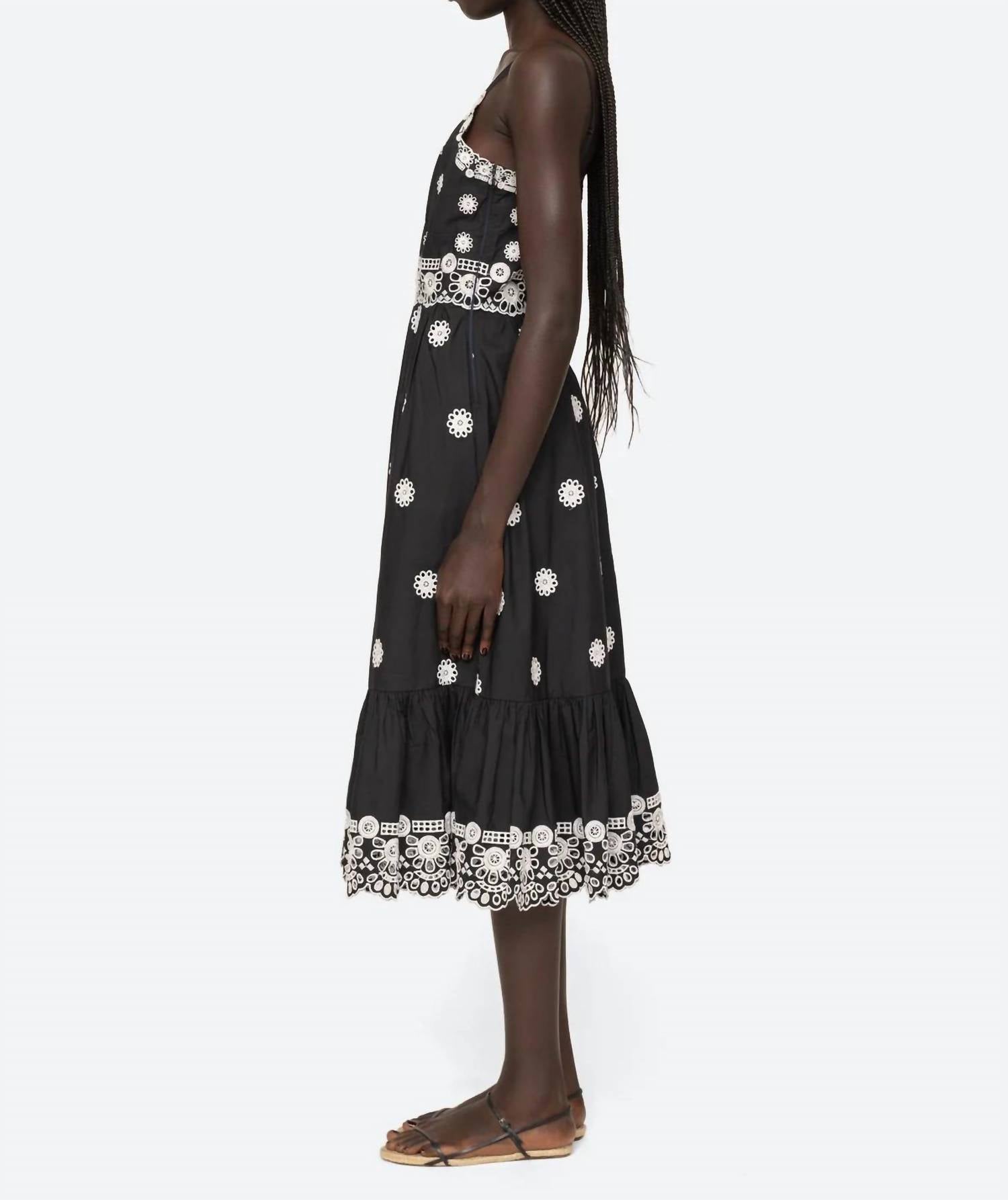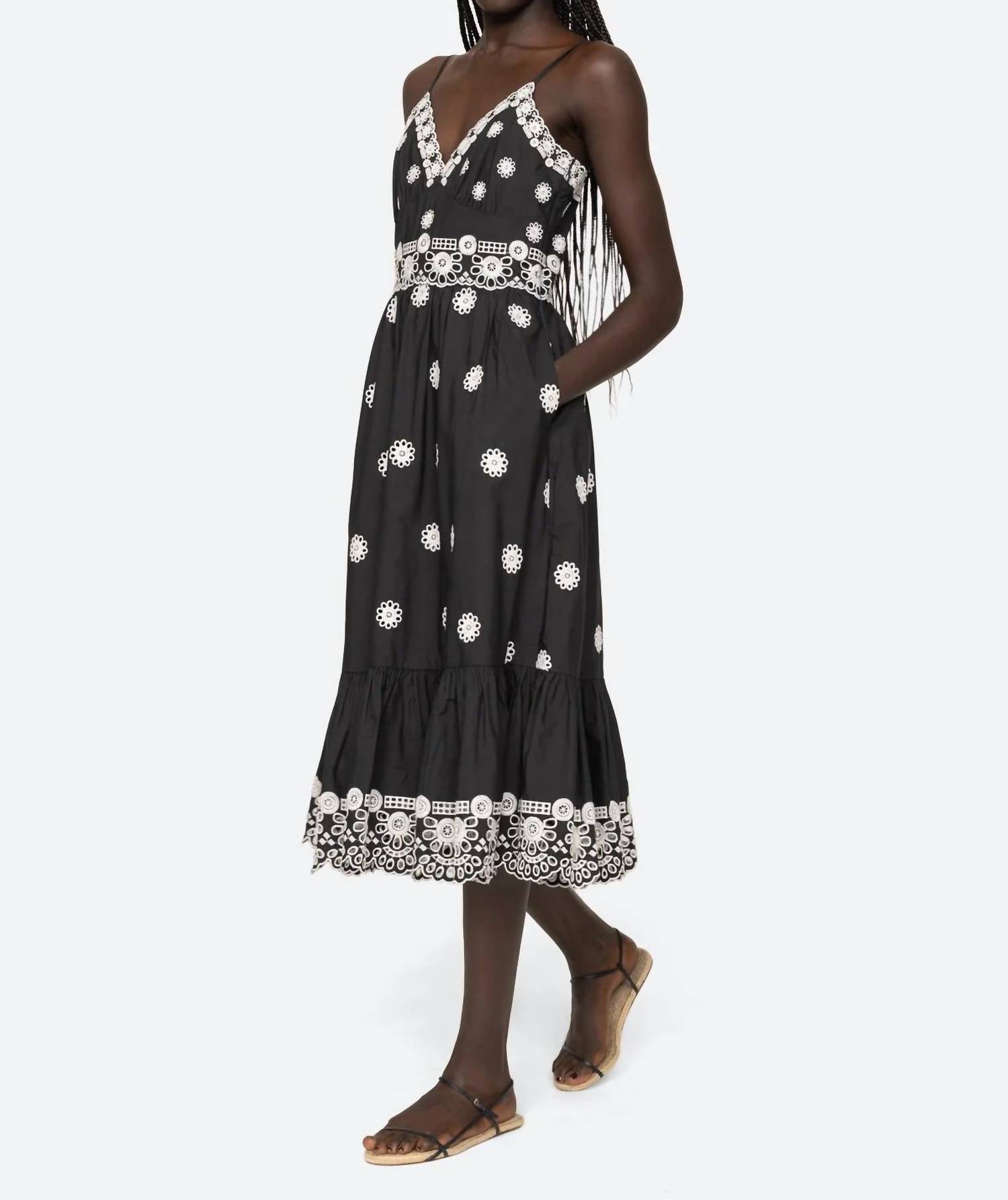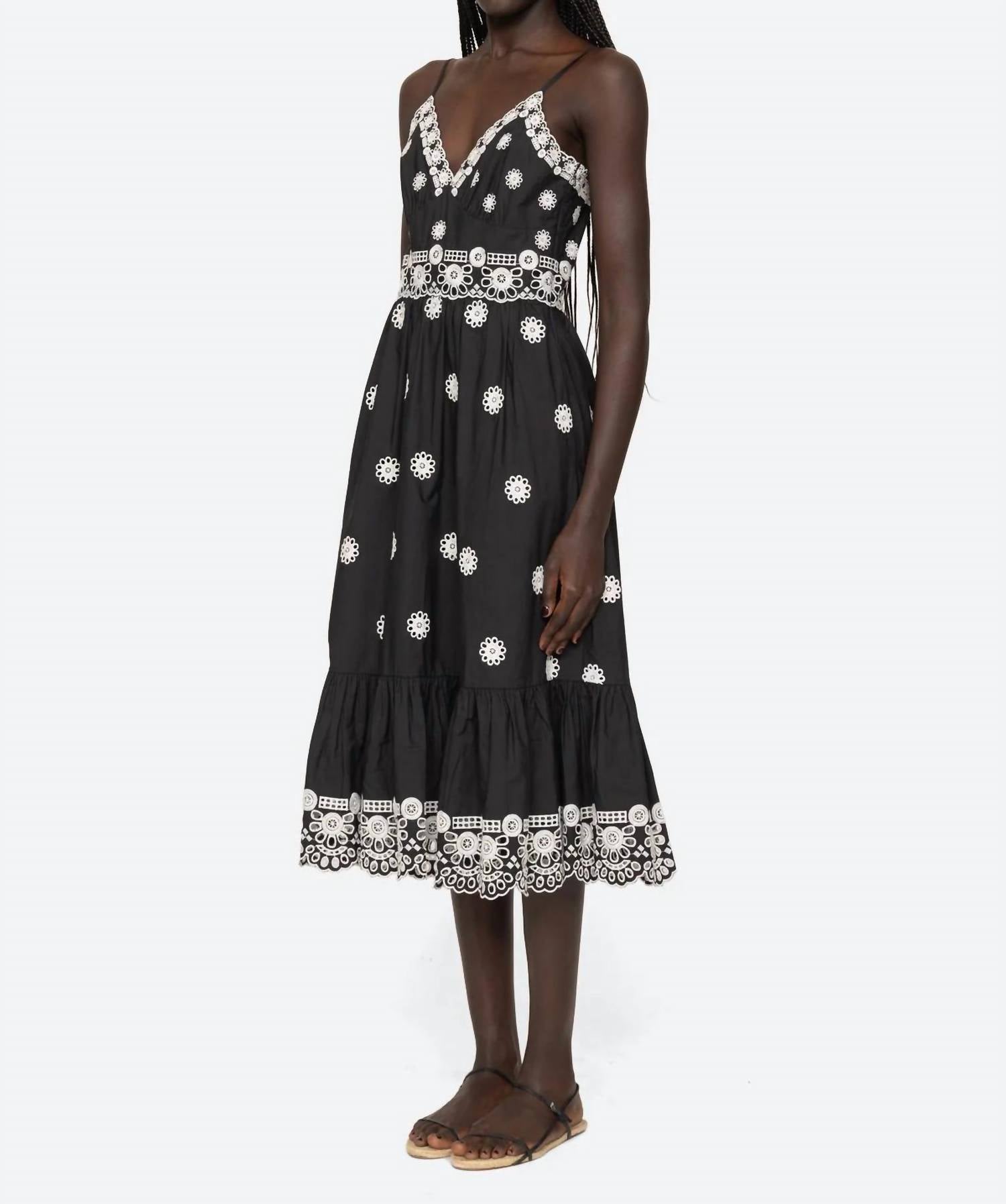 Discover the SEA Elysse Dress, a charming piece with delicate embroidery and eyelet detailing throughout. This midi dress features adjustable spaghetti straps and is crafted from 100% cotton for breathable comfort. The elegant sweetheart neckline complements its A-line silhouette, designed to flatter with a slimmer fit. It includes pockets for convenience and secures with an invisible side zipper for a seamless finish.