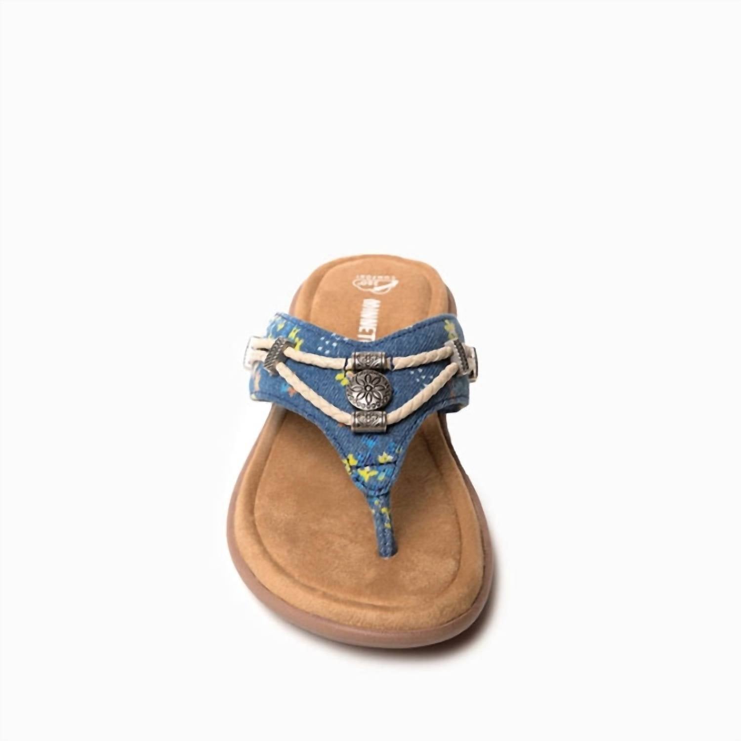 Classicly cute and all-day-wearable. We love this sandal. Introducing the Women's Silverthorne 360 Toe Post Sandal by Minnetonka, a chic addition to your summer wardrobe. Designed in a stylish floral denim, this sandal comes with a genuine leather or fabric print upper and a microfiber foam lining. Enjoy 360° memory foam cushion insoles for ultimate comfort, paired with a lightweight EVA outsole that features a wider last for added stability. Complete with iconic metal ornaments, it's the perfect blend of style and function for the modern woman. Imported and true to size.
