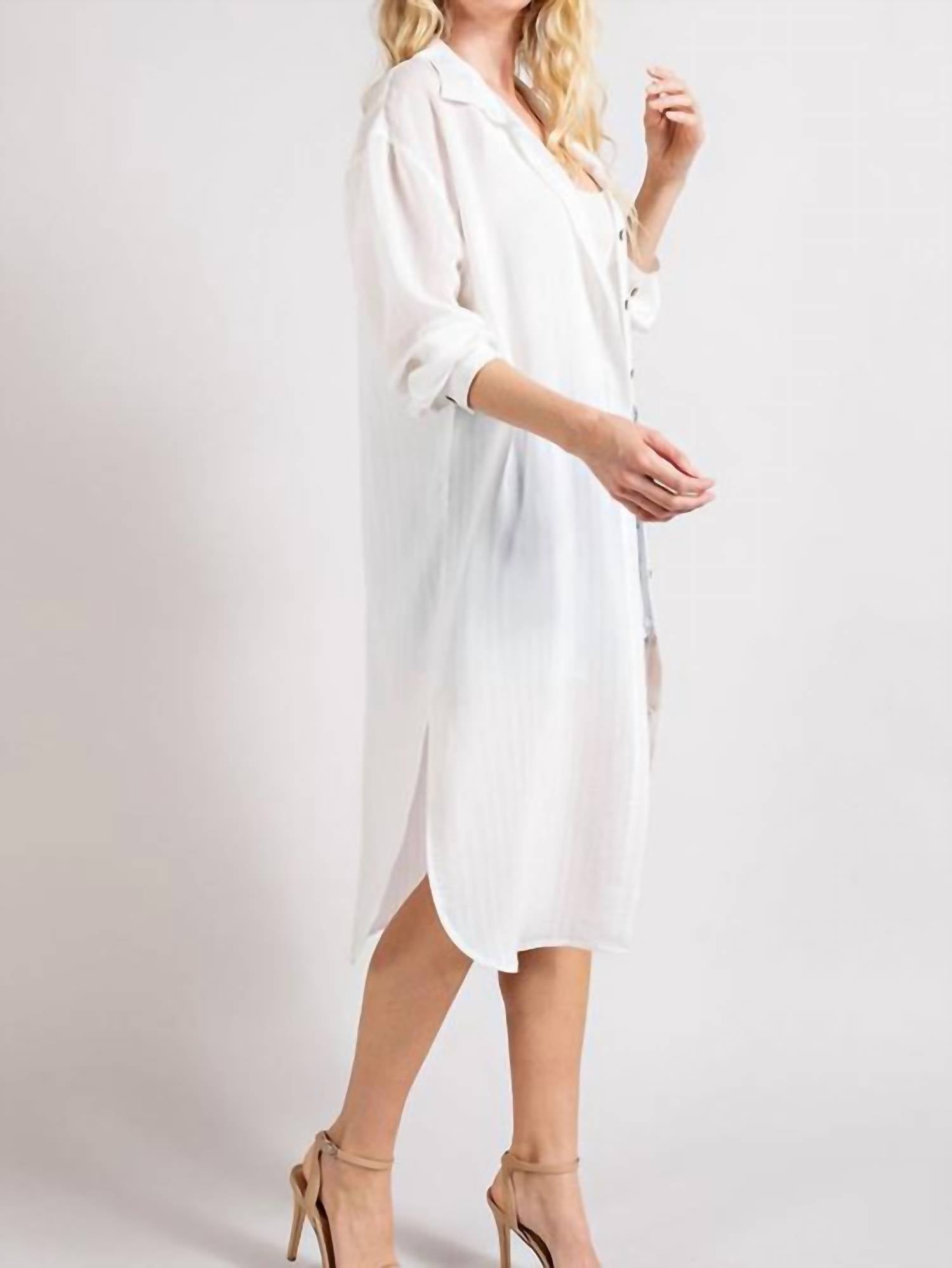 A jacket so versatile you can literally wear it with anything. Experience ultimate style and comfort with the Button Down Long Jacket by ee:some in a crisp white hue, perfect for a casual ensemble. This long sleeve jacket is elegantly adorned with a striped pattern, featuring a classic collar that adds a touch of sophistication. The jacket closes effortlessly with a front button closure, ensuring a snug fit. Perfect for women seeking a chic and versatile layering piece.