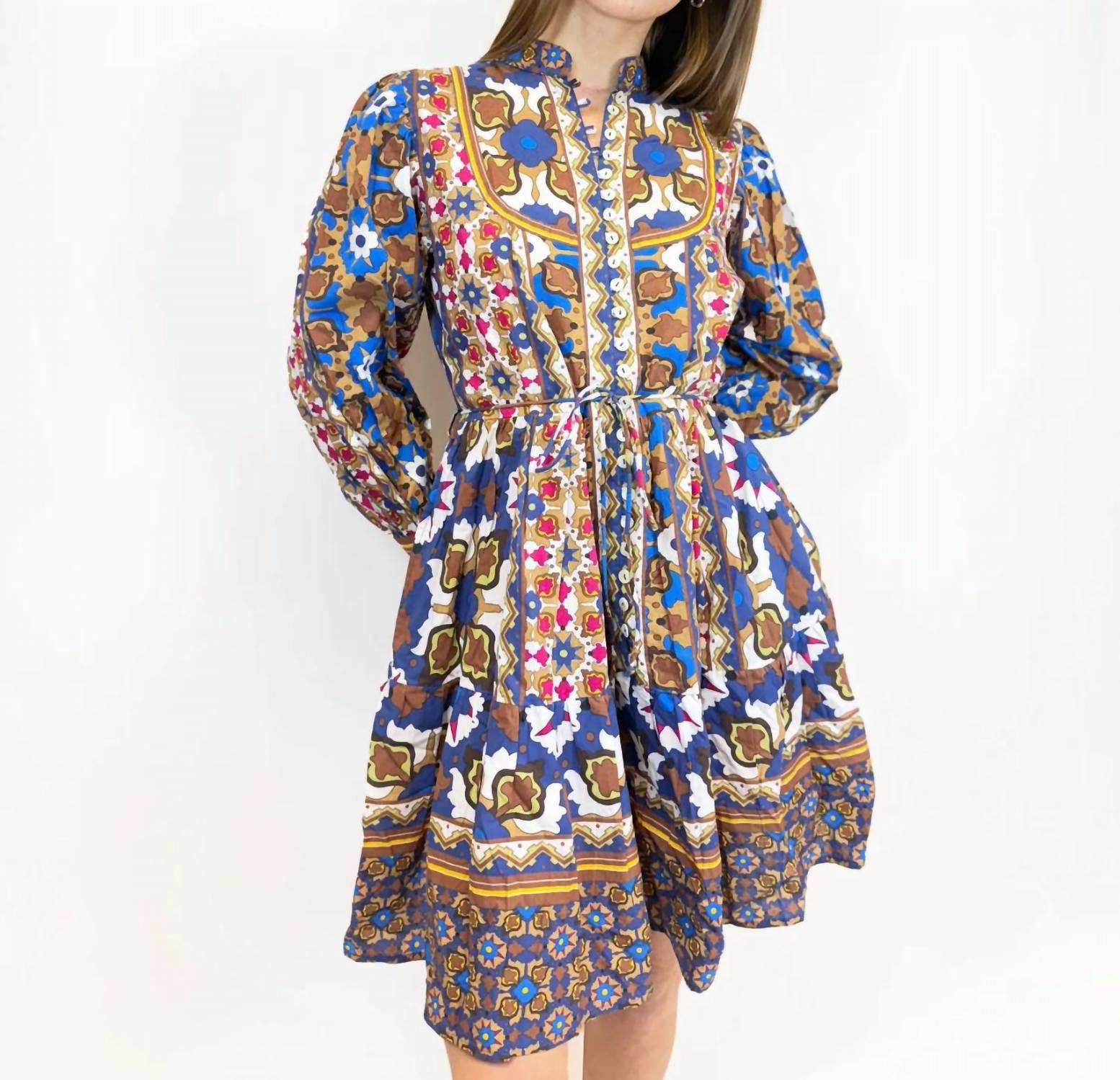 A short and breezy dress for those warmer days. Embrace autumn with the Andi Dress by Farylina, an enchanting piece in a Brown Mosaic pattern that exudes boho chic charm. Made from organic cotton and featuring a fit and flare silhouette, this above-the-knee dress comes with long sleeves and a classic collar. The versatile button closure and self-tie fabric belt allow for personalization, whether worn loose for a bohemian vibe or cinched for a defined waist. Perfect for vacation and Thanksgiving celebrations, its thoughtful design ensures you stay stylish throughout the fall season, especially when paired with a tall boot.