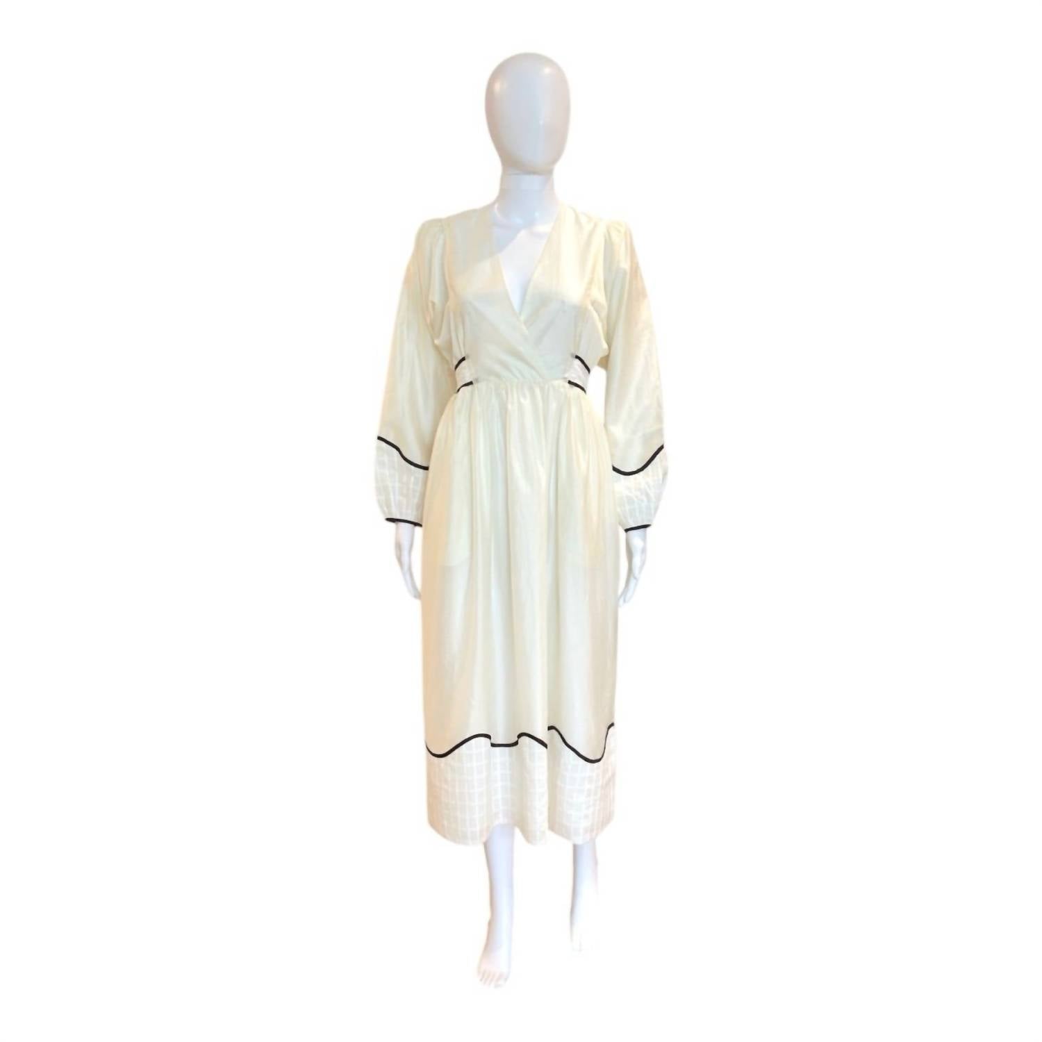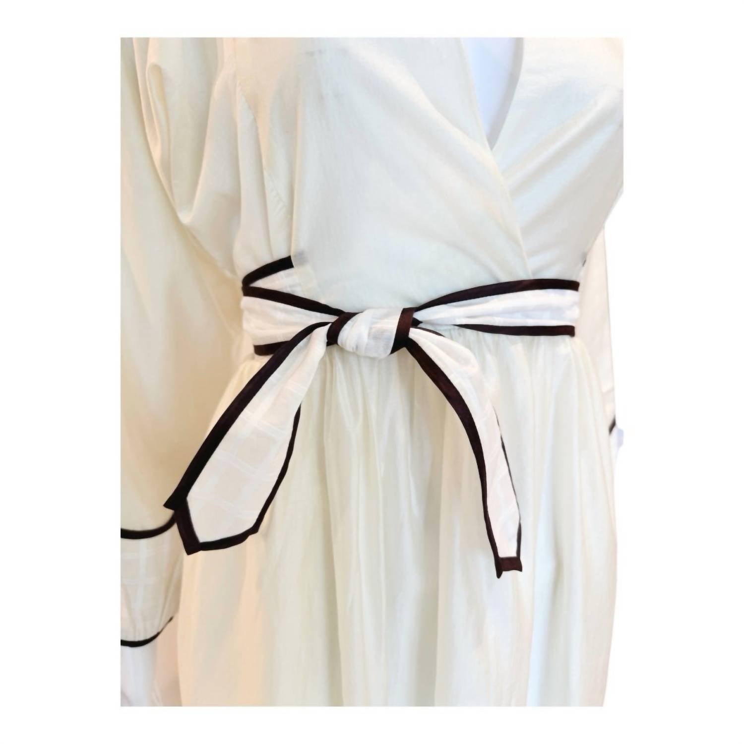 Introducing the Gabrielle Dress by Love Binetti, where sophistication meets practicality in this exquisite piece. This long-sleeve, V-neck silk dress features intricate brown tape trim and a tie closure, enhancing both style and function. Color: Cream & Brown. Dress Silhouette: Kaftan. Ideal for those who value luxury and exclusivity in their wardrobe.