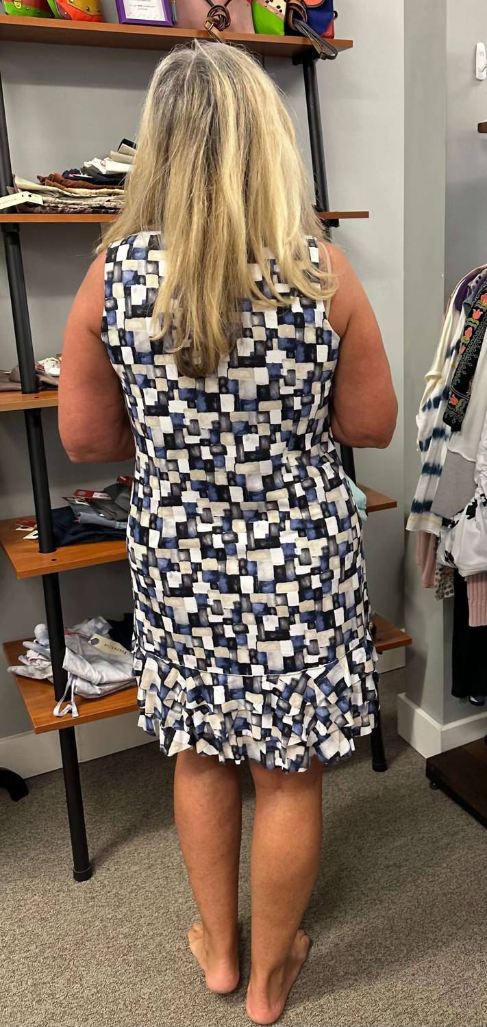 The perfect mini dress for those warmer months. Introduce yourself to carefree summer style with the Beachtime Ruffle Trim Sleeveless Dress by Lulu-B, perfect for making a statement with its vibrant array of blue tones. This mini shift dress captivates with its geometric pattern and elegant scoop neck, ensuring standout appeal. Crafted from a comfortable nylon blend, it embodies the brand's creativity and playfulness. Whether you're at a dinner party or celebrating New Year's Eve, this dress offers UV protection with UPF50+ and features a cooling element to keep you comfortable.