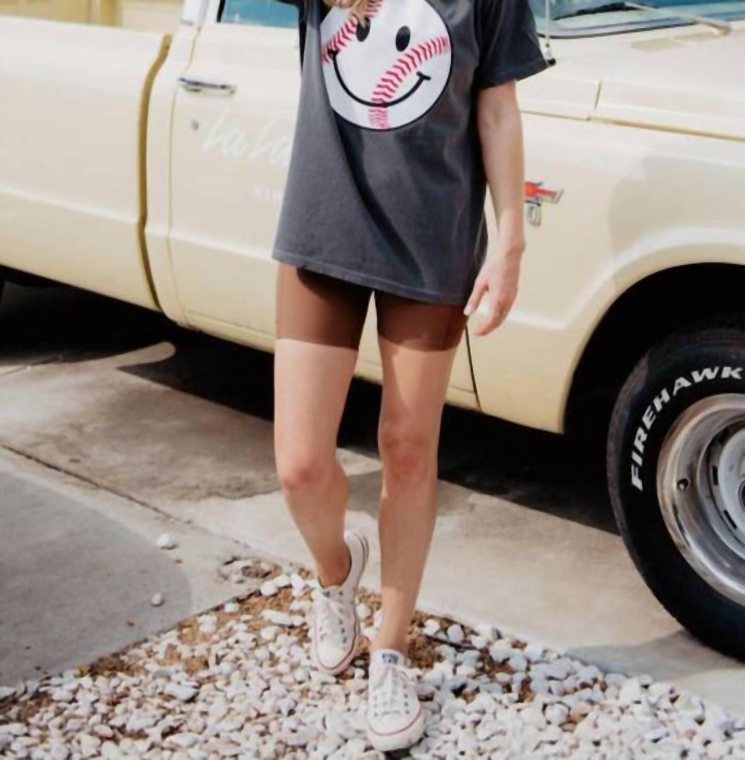 The short sleeve tee you'll want in every color. Add a playful twist to your wardrobe with the Baseball Happy Face Cute Graphic Tee by Katydid, perfect for women who love comfort and style. This short-sleeve tee in a Pepper hue is made from 100% ring spun cotton, featuring a soft, garment-dyed fabric designed in the USA for that ultra-comfy feel. With its classic crewneck and pull-on closure, it's easy to wear on any casual day or at a holiday party. Size up for an oversized fit and embrace the fun streetwear trend this Thanksgiving.