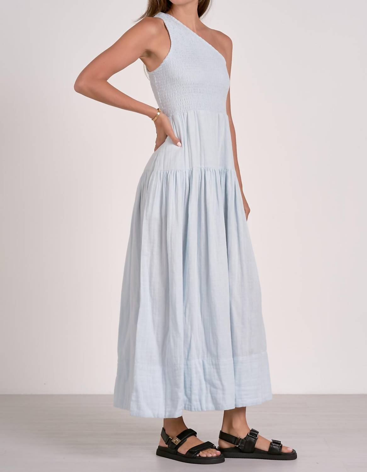 A maxi dress that is just as cute as it is comfortable. One-Shoulder Maxi Dress – Light BlueMake a statement in effortless elegance with this One-Shoulder Maxi Dress. Designed in a soft light blue hue, it features a flattering off-one-shoulder neckline and a stretch-fit top that provides both comfort and style. The flowing cotton skirt creates beautiful movement and an airy feel, perfect for warm days or breezy evenings. Whether dressed up with heels for a summer party or styled casually with sneakers, this versatile piece ensures you look chic and feel comfortable wherever you go.Details:Off-one-shoulder necklineStretch top for a flexible, flattering fitFlowing 100% medium-weight cotton skirt (not see-through)Maxi length – see size chart for best fitLight blue colorMade in India