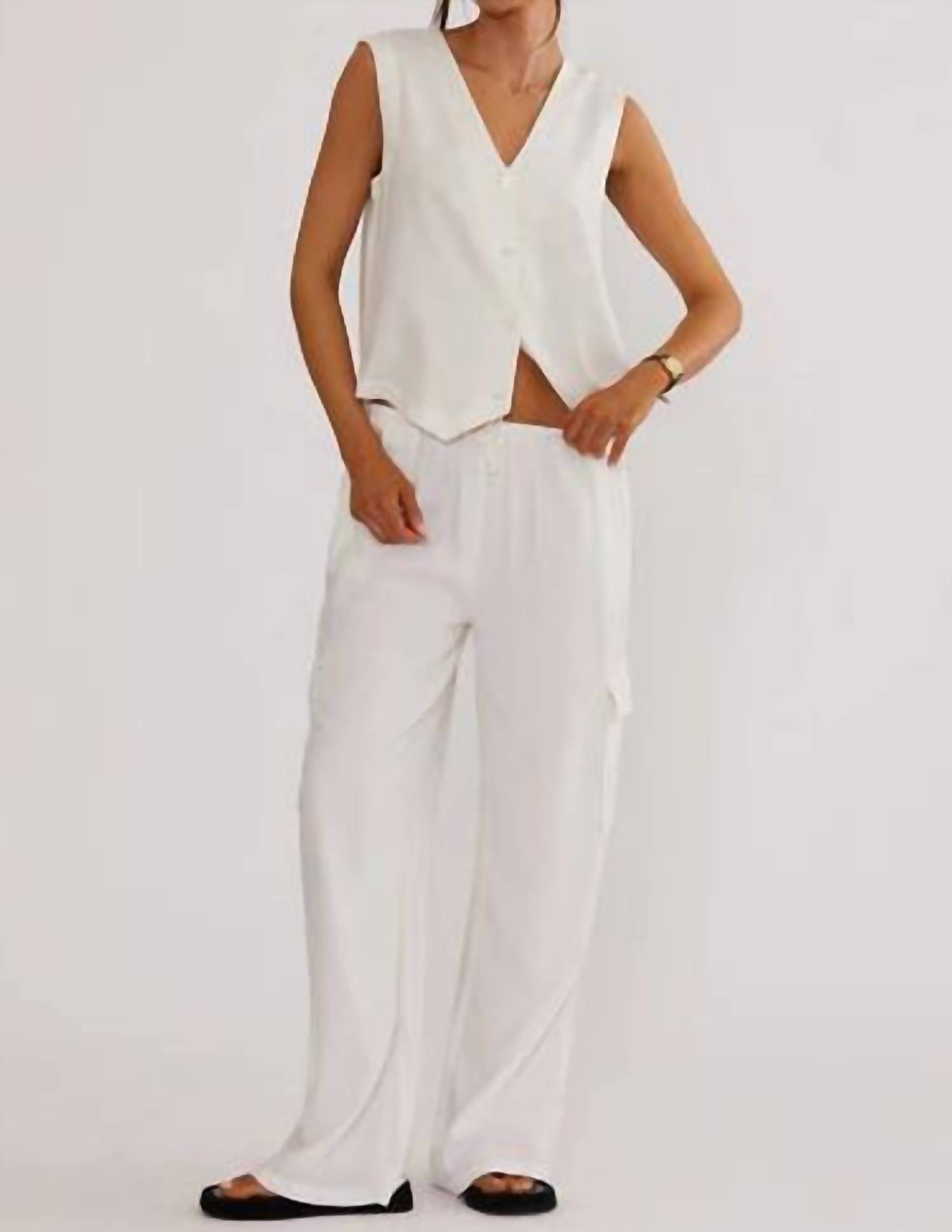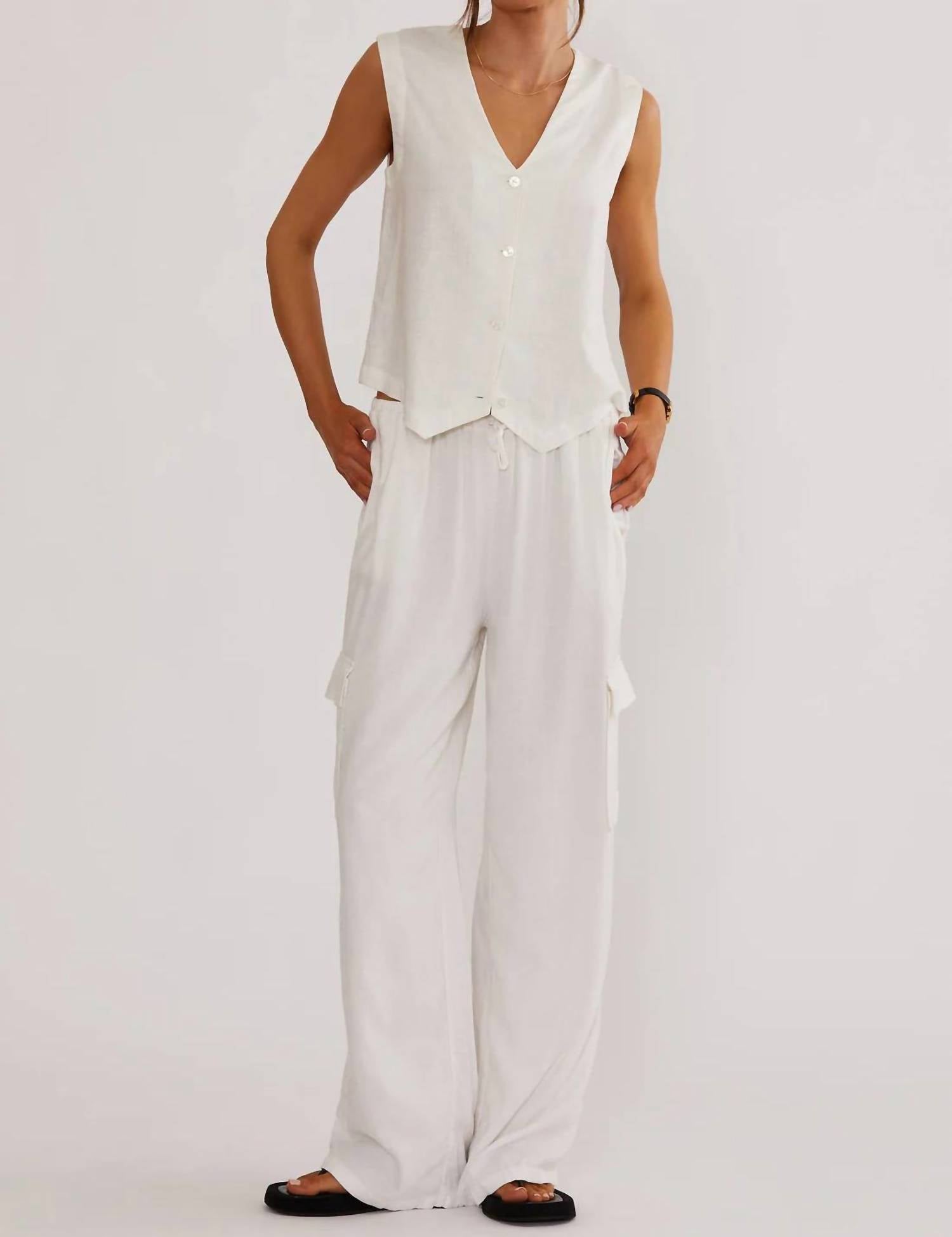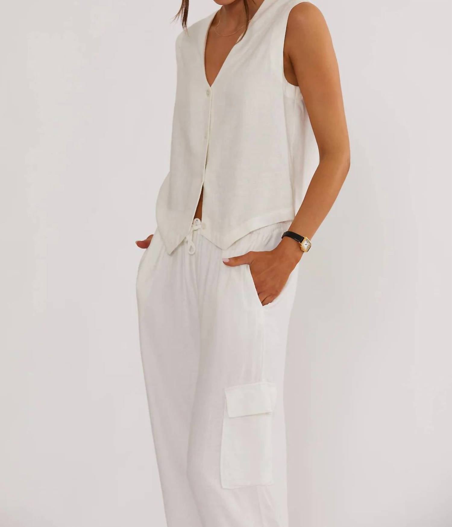 Throw this vest over an all black outfit for a perfectly polished look. Introducing the Darcy Vest by Beach Riot, perfect for minimalist summer vacations. This sleeveless vest, crafted in solid white linen, features a chic V-neck and a convenient button closure. It's designed without pockets and lining for a sleek silhouette. Care: Hand wash and line dry.