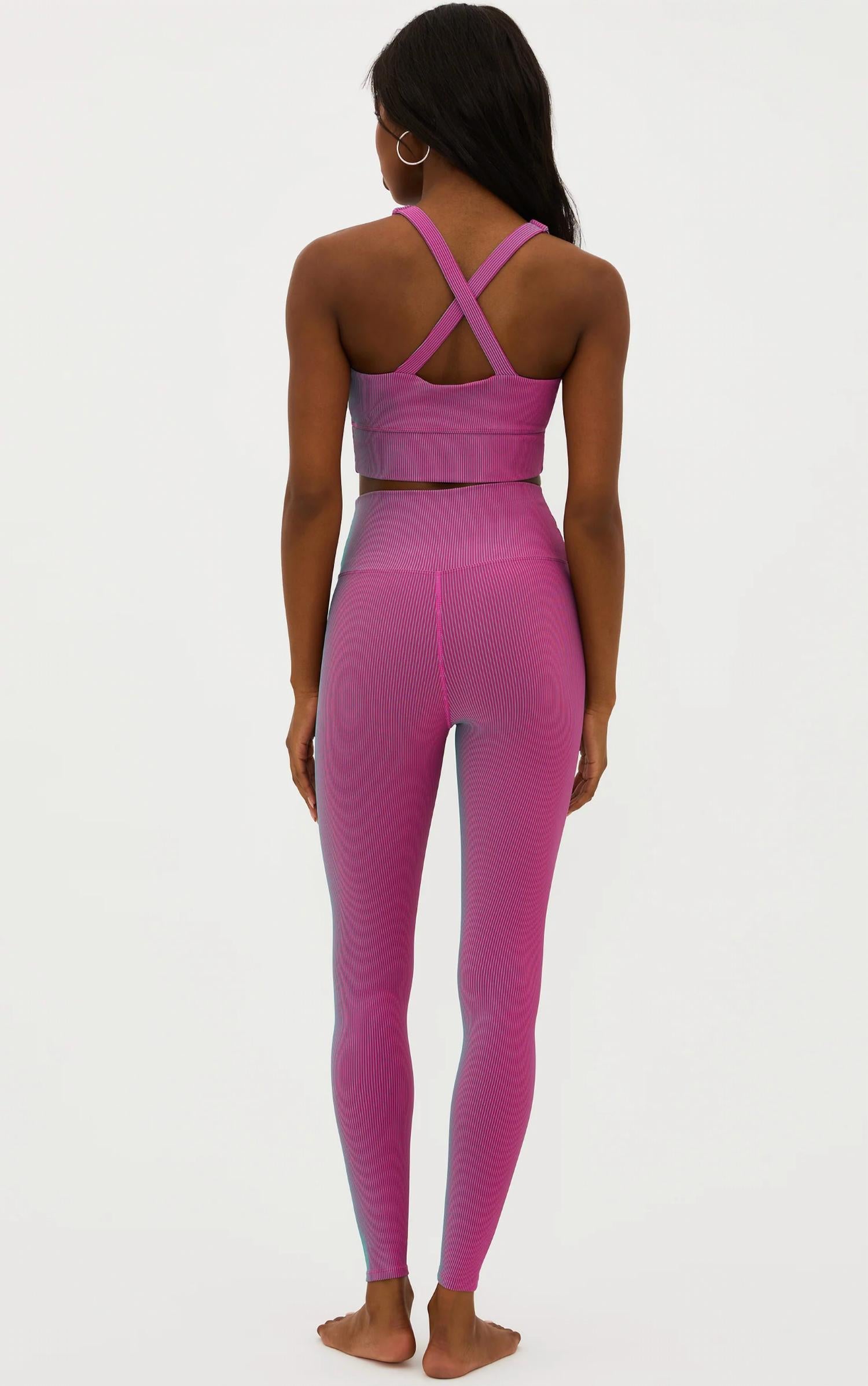 Leggings you can dress up or down for any occasion. Discover the Tayler Legging by Beach Riot in a stunning sorbet hue. These best-selling two-toned ribbed leggings offer a flattering skinny leg design and high-rise waist, perfect for loungewear or leisure activities. Made from a sustainable blend of 66% recycled nylon, 11% polyester, and 23% spandex, these leggings deliver comfort and style in a slim fit profile. With a convenient pull-on closure, they seamlessly pair with the matching Mindy Top and Occulus Sweater for a chic ensemble. Model is wearing a size small.