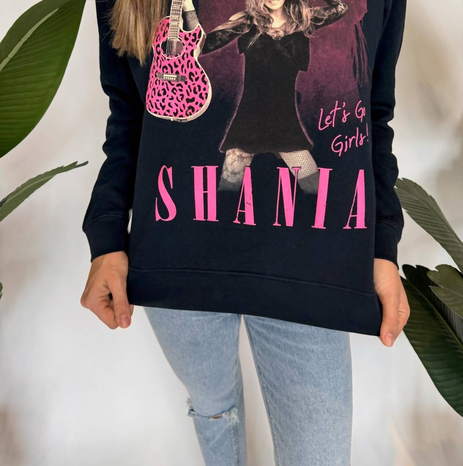 Introducing the Shania Twain Leopard Guitar Vintage Sweatshirt by DAYDREAMER, a stunning tribute to the country music icon. This long sleeve sweatshirt in a striking Black Onyx features bold graphics, including Shania's name and a pink leopard guitar. Crafted from a comfortable blend of 83% Cotton and 17% Polyester, it is designed with a convenient pull-on closure. Made in the USA, this piece demands special care: hand wash cold and lay flat to dry, or opt for dry cleaning. Model Alyssa, standing at 5'10", is wearing a size small.