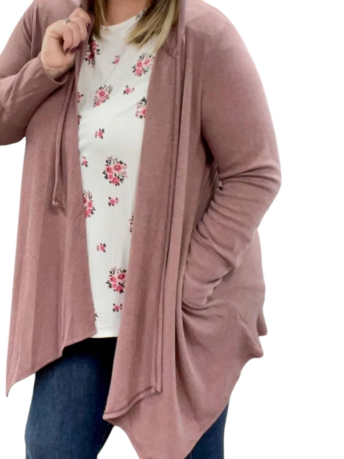Long sleeves. Open front. Pocket. Attached hood with drawstring. 85% Polyester 10% Rayon 5% Spandex. Machine wash cold.