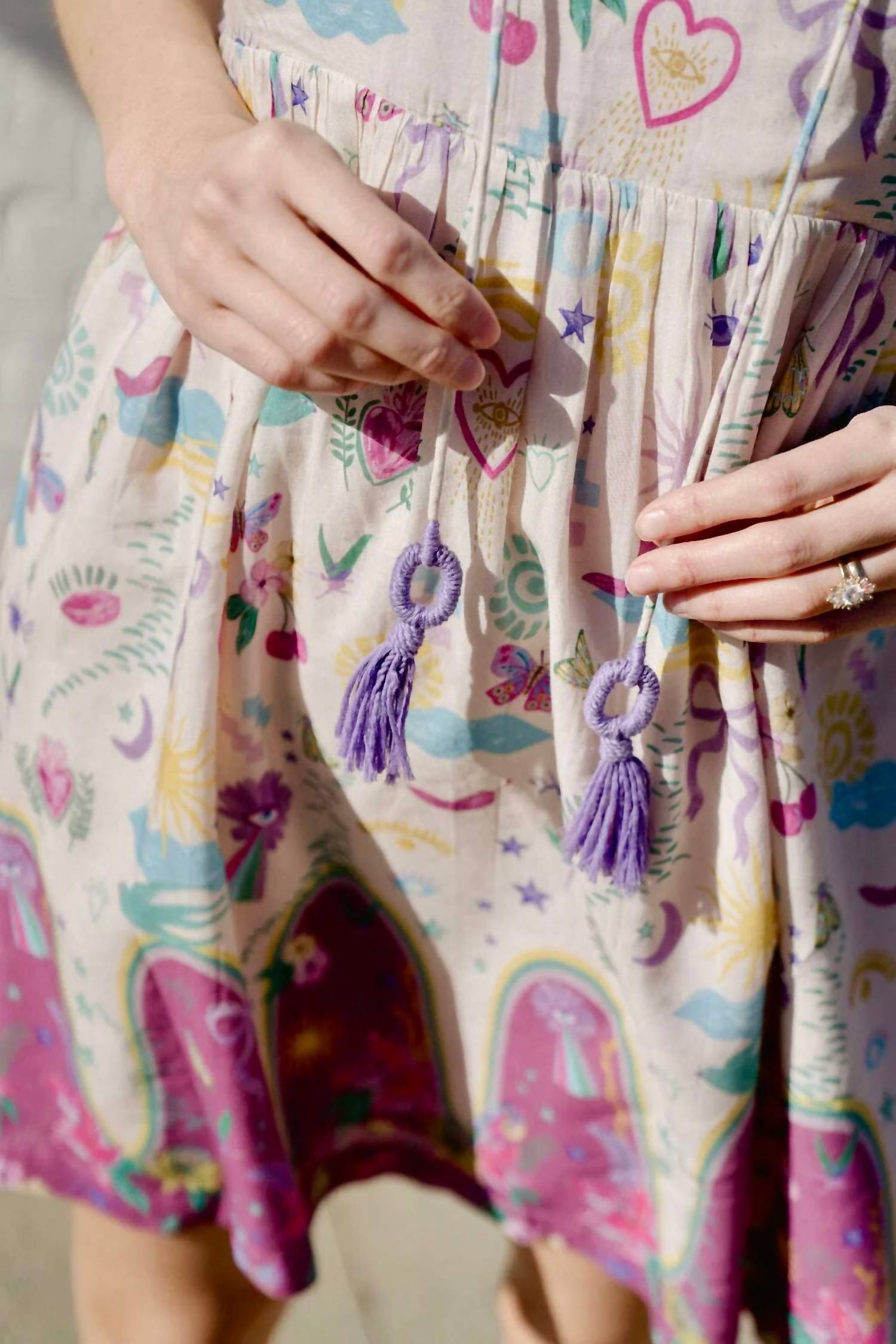 The perfect mini dress for those warmer months. Presenting the Josie Mini Dress by BRITON COURT, a chic choice for your vacation wardrobe in a stunning cream hue. This sleeveless shift dress is crafted from viscose and showcases a stylish V-neck and a tie closure. Its patterned design captures the essence of a maximalist summer vibe. For care, machine wash and line dry to keep this dress looking fabulous all season long.