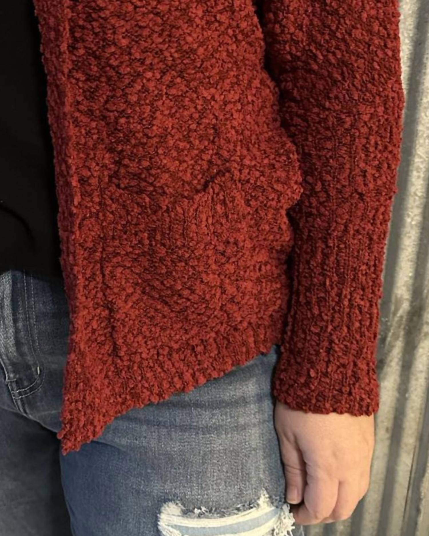 A classic fit that works just as good buttoned as it does left open. Embrace cozy style with the Popcorn Cardigan - Plus from ADORA, designed in a rich burgundy hue. This long sleeve knit cardigan features a textured finish and handy pockets for added practicality. Made from 60% polyester and 40% acrylic, it offers a soft touch and easy pull-on closure for effortless wear. Perfect for fall travels, this maximalist piece presents a stylish V-neck silhouette ideal for layering. Model size: 1/2X.