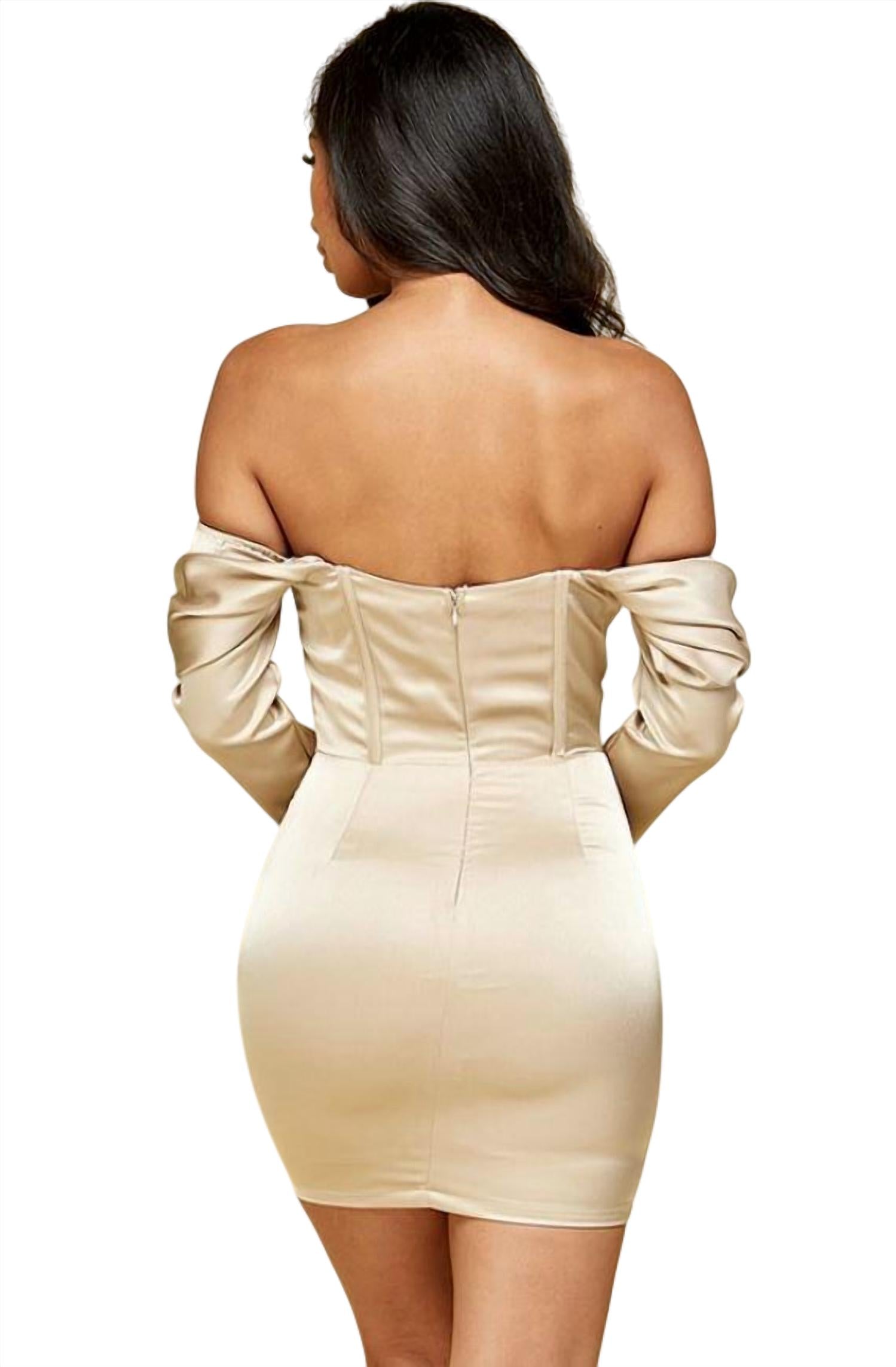 The perfect mini dress for those warmer months. Off-shoulder design with a fitted corset-style bodice. Long ruched sleeves. Mini-length with a body-hugging fit. Back zipper closure ensures a snug fit.