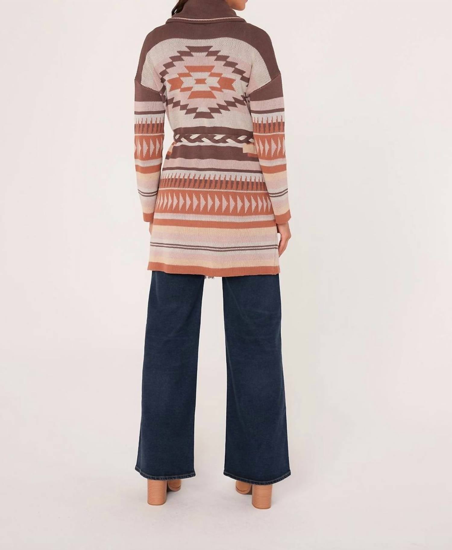 This cardigan will be a sweater-rotation favorite. Wrap yourself in the timeless elegance of the Sierra Sunset Jacquard Wrap Cardigan by LOVESTITCH. This women's cardigan boasts long sleeves and is meticulously crafted from 100% soft cotton, featuring a captivating geometric pattern in taupe and blush hues. The design includes a flattering shawl collar and practical patch pockets, while the pull-on style is complemented by an adjustable braided waist belt. Perfect for holiday gatherings, this boho chic piece is easy to care for with machine wash and tumble dry instructions.