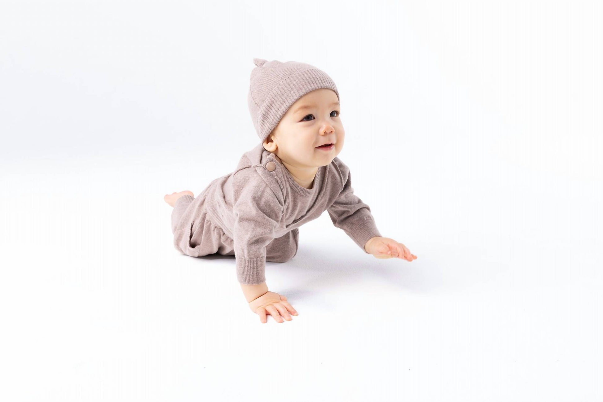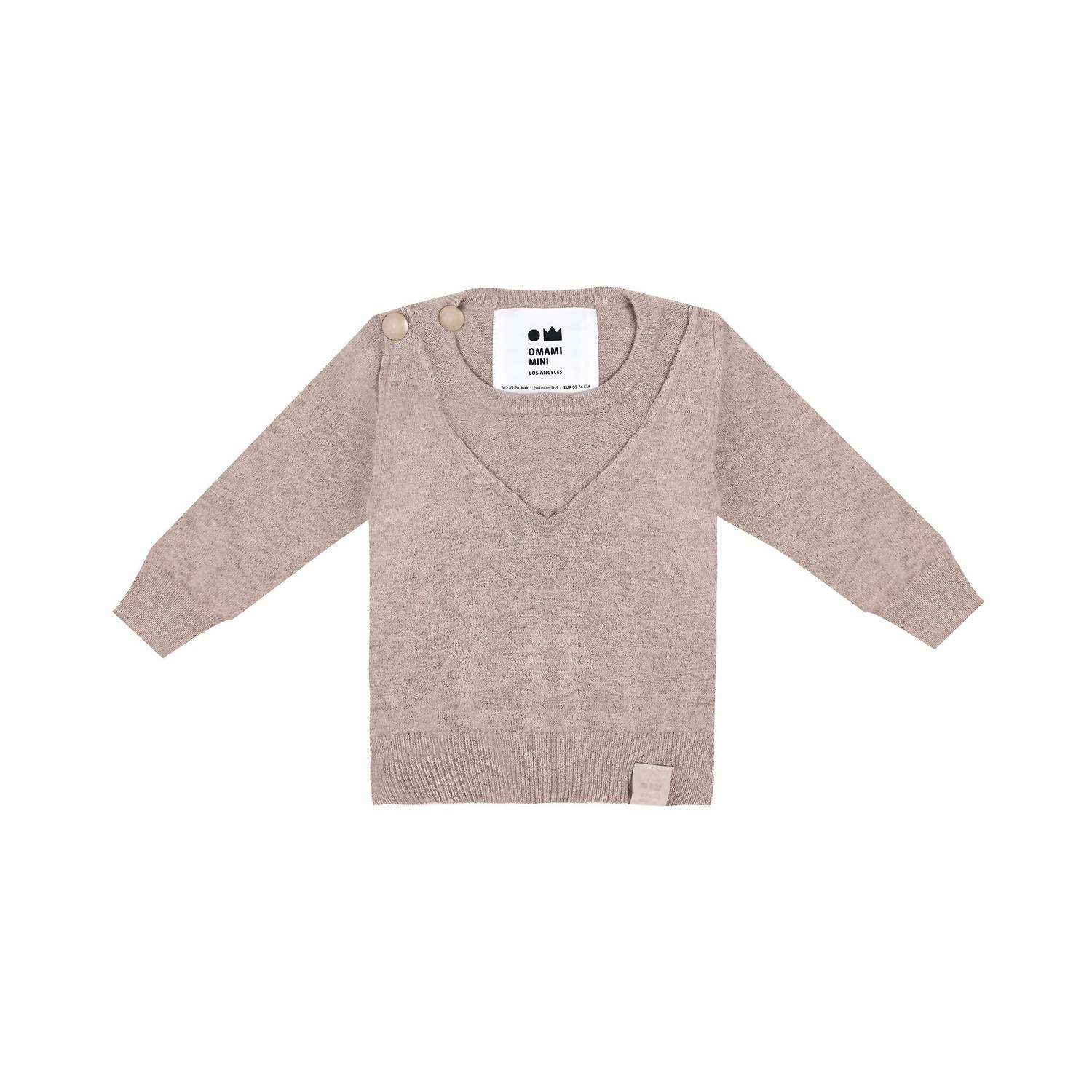 Cashmere like (yet machine washable) material that'll keep your kid warm and cozy. Ribbed sleeve and hem. Raw finish triangle yolk detail up front. Crew neck with shoulder snaps opening. 26% cotton, 47% polyester, 27% spandex. Machine wash, do not tumble dry. Please note the faux leather logo label shown in pictures won't appear on actual garments.