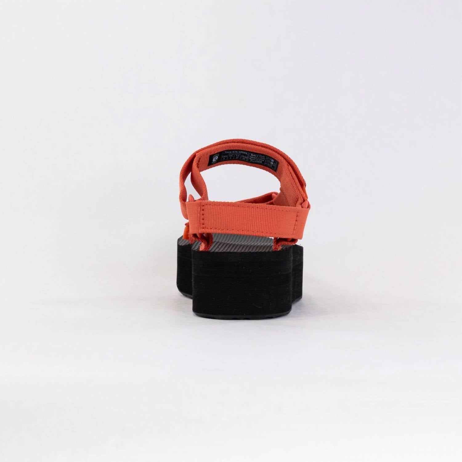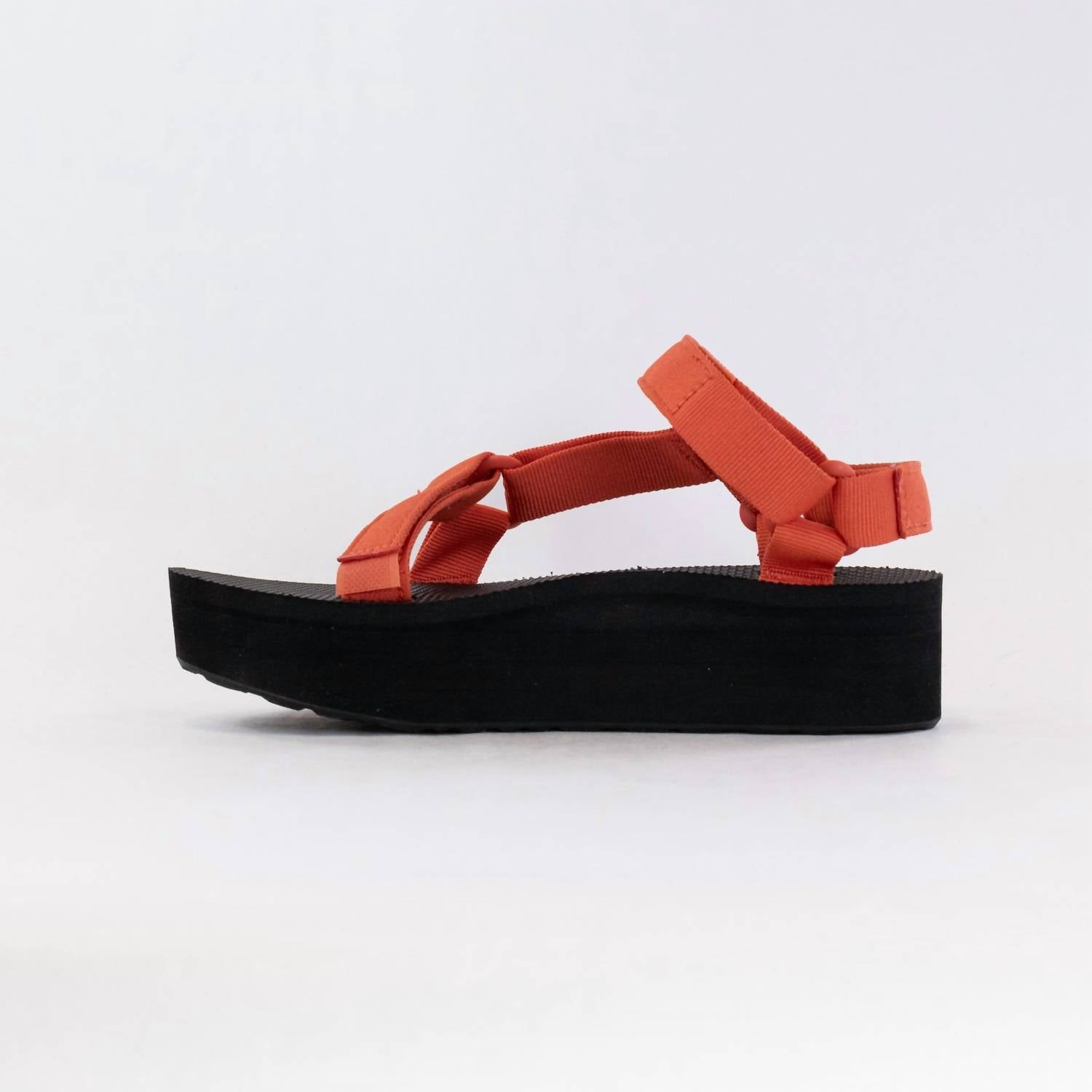 This sandal will take you from brunch to dinner and everything in between. Step into sustainable style with the Teva Women's Universal Flatform Sandals in Tigerlily. Crafted with recycled REPREVE® polyester yarn by Unifi®, these sandals feature a Universal Strapping System™ and quick-drying webbing designed to support your foot. The sandals boast a comfortable molded EVA midsole and a durable rubber outsole for traction, complemented by an easy hook-and-loop closure for a perfect fit. With a 1.75" platform heel, they offer a minimalist, eco-friendly option perfect for travel and festival wear.