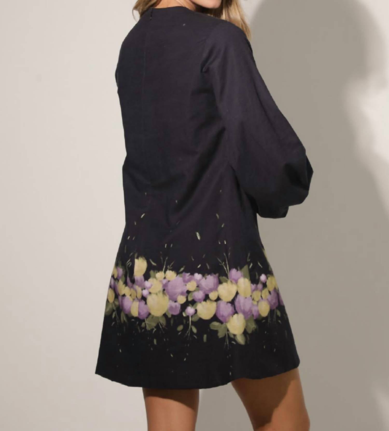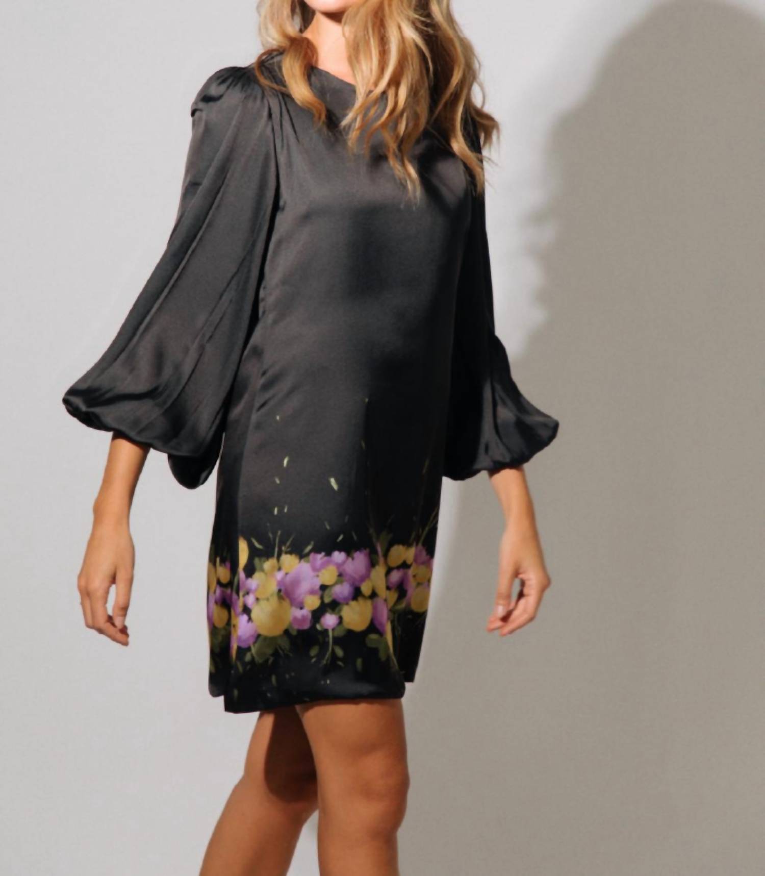 The kind of easy and flattering dress you'll be reaching for all season long. Introducing the Fiorella Dress from Kleid, a chic mini dress perfect for cocktail parties. With its three-quarter balloon sleeves featuring elastic cuff adjustment, this dress boasts a sleek shift silhouette and a back opening. Made from high-quality polyester with a striking graphic pattern inspired by the serene elegance of the camellia flower, it captures both timeless and romantic styles. Color: Garden Black. Closure: Zip closure. Care instructions: Dry clean. Ideal for spring with a crewneck and no pockets, this dress captures the essence of 90s fashion while offering a sophisticated look for any occasion.