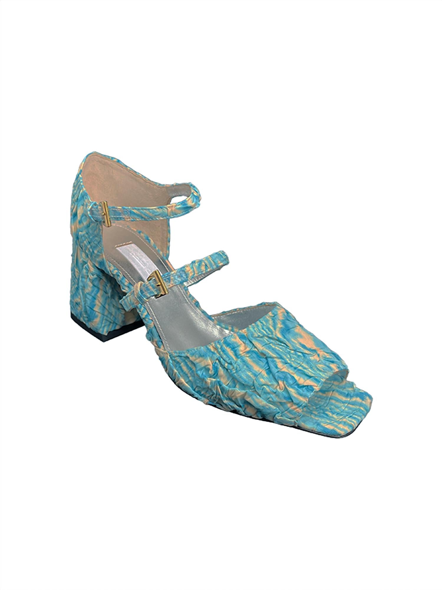 The perfect height for day to night. Crafted in a stunning Aqua Plisse pleated fabric. Delicate gold buckle straps. Elegant open toe design pair beautifully with the covered angular block heel, standing at a comfortable 3 inches. Luxuriously lined with metallic leather and completed with Italian leather soles. Promise both style and durability. Made in Italy. Running true to size.