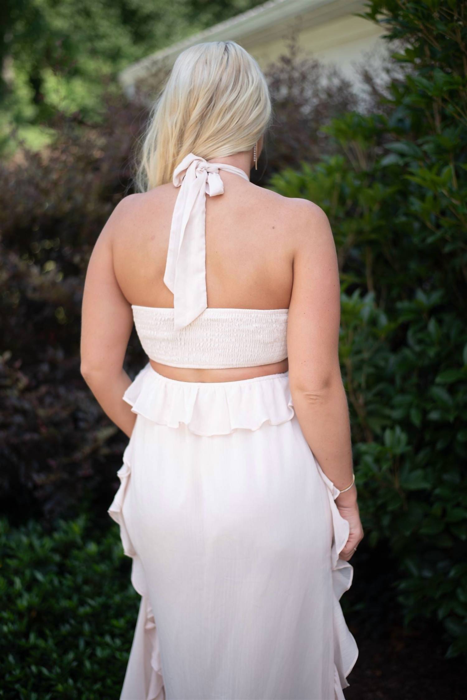 Who doesn't love a good maxi dress? This one you'll be reaching for season after season. Introducing the Women's Sarah Halter Neck Maxi Dress by PRIVY, a minimalist masterpiece ideal for autumn getaways and engagement photos alike. This sleeveless maxi dress in a solid oyster color flatters with its fit and flare silhouette and adjustable halter neckline, while a smocked back and breathable slit add comfort and ease. The pull-on design ensures hassle-free wear. Embrace a sophisticated yet effortless look in this timeless piece.