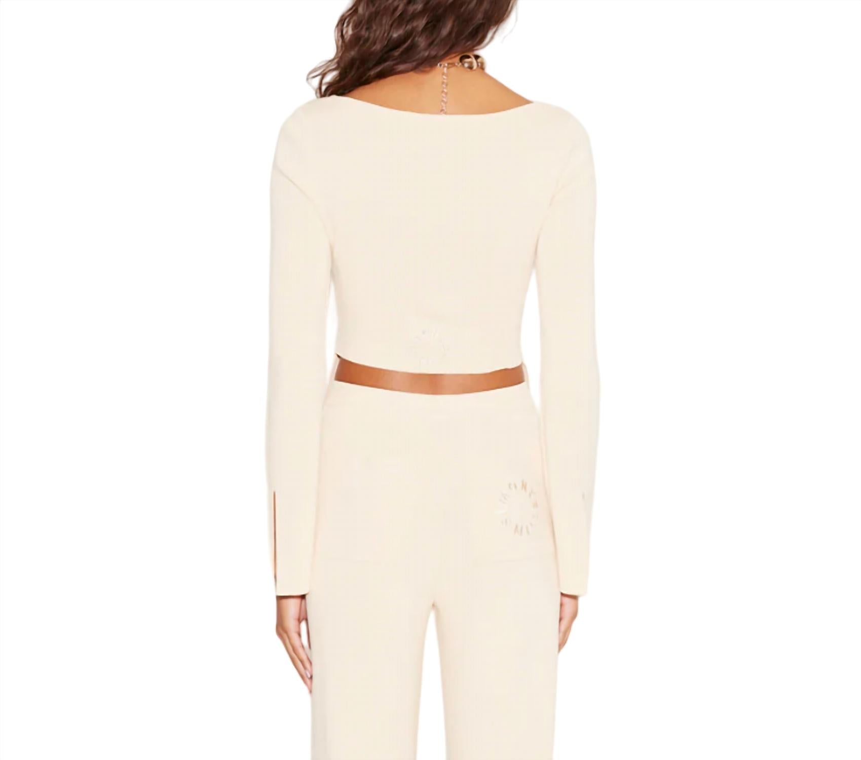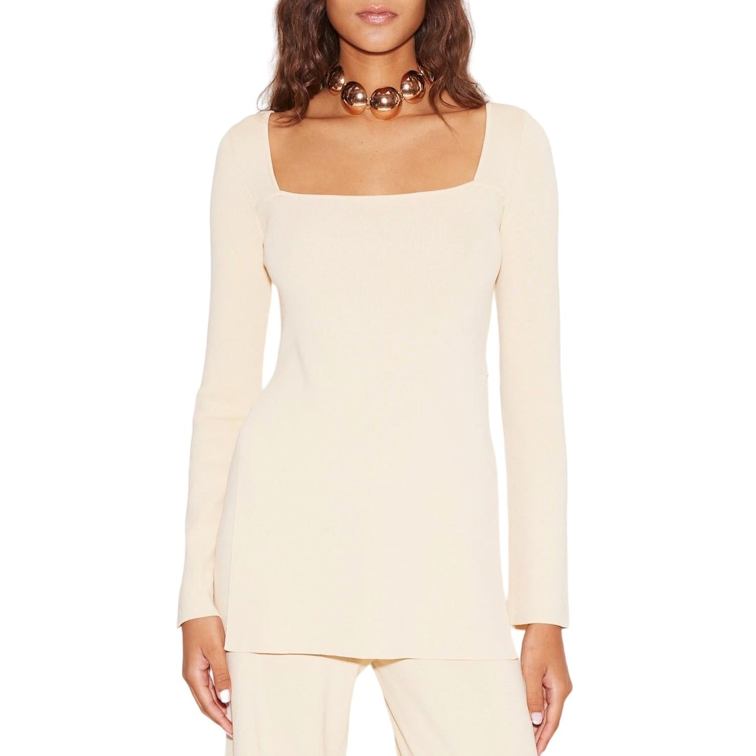 A long sleeve, sculpted fit top with a square neckline, flared sleeves, and side slits. Fabric: 65% viscose, 35% nylon. Care: Machine wash cold. Do not bleach. Tumble dry normal. Iron on low heat.