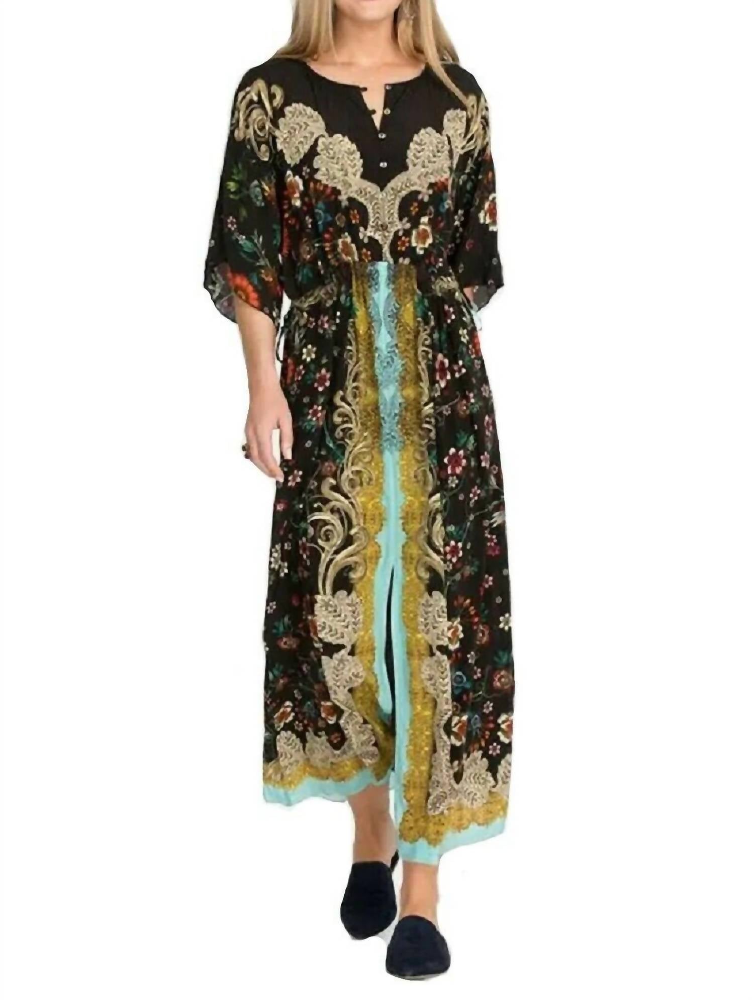 With long flowy fit and on-trend fall prints. Subtly cinched waist and retro-style bell sleeves. Slip Included. Pockets on Seam. Front Slit on Skirt. Side Ties. 100% Silk. Model is wearing a size small. Measurements for size medium: Length- 54", Bust- 50 3/4". Dry clean only. Made in China.