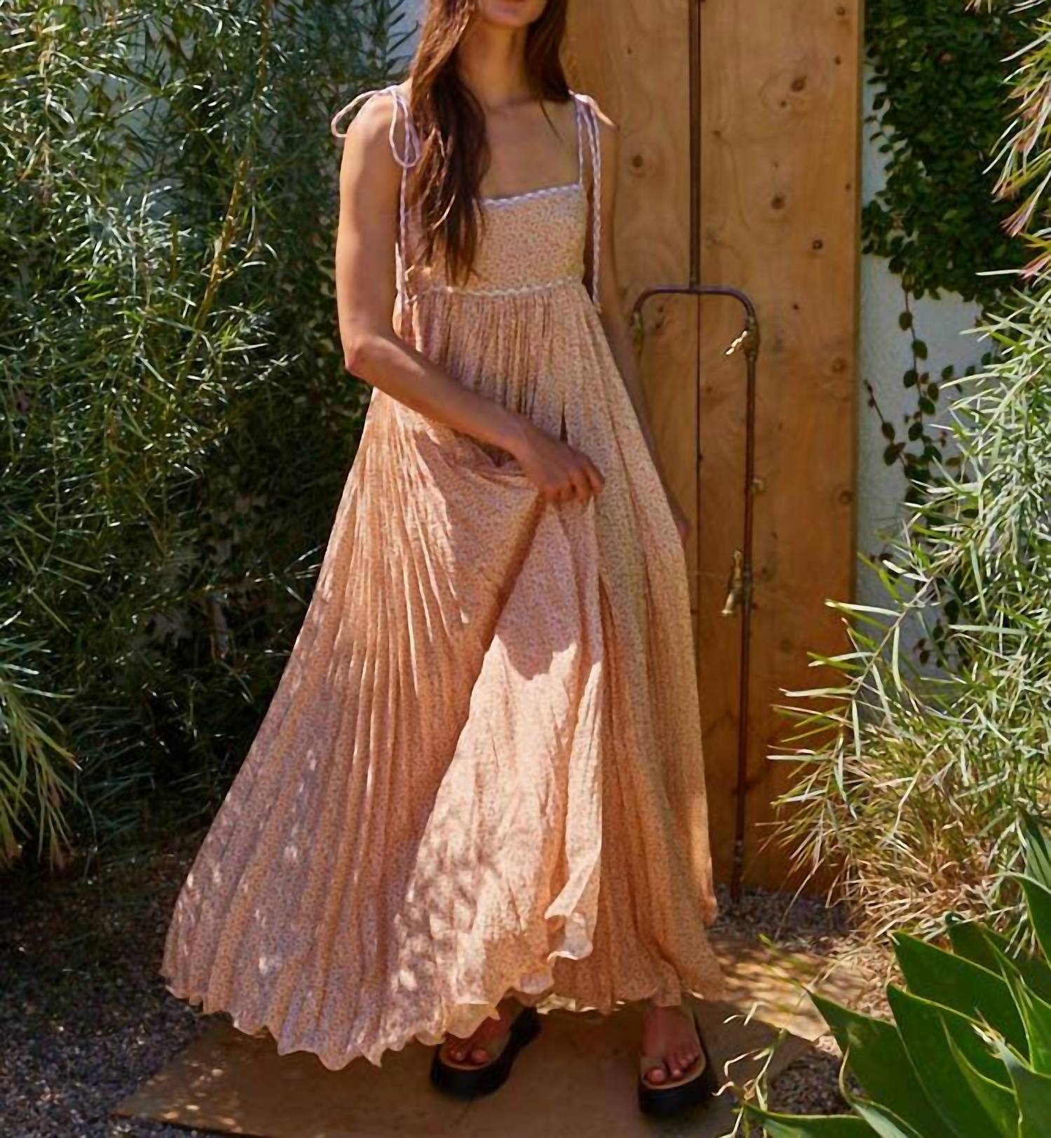 Style this maxi with your favorite statement necklace and sandals for the perfect look. Elevate your vacation wardrobe with the By Together Floral Print Open Back Pleated Maxi Dress, a boho chic piece designed in a taupe cotton blend. Featuring spaghetti straps and a stunning open back, this maxi dress embodies effortless elegance with an A-line silhouette and a squareneck. Ideal for spring and special occasions like Valentine's Day, it offers a pull-on closure for easy wear. Care: Machine wash and tumble dry.