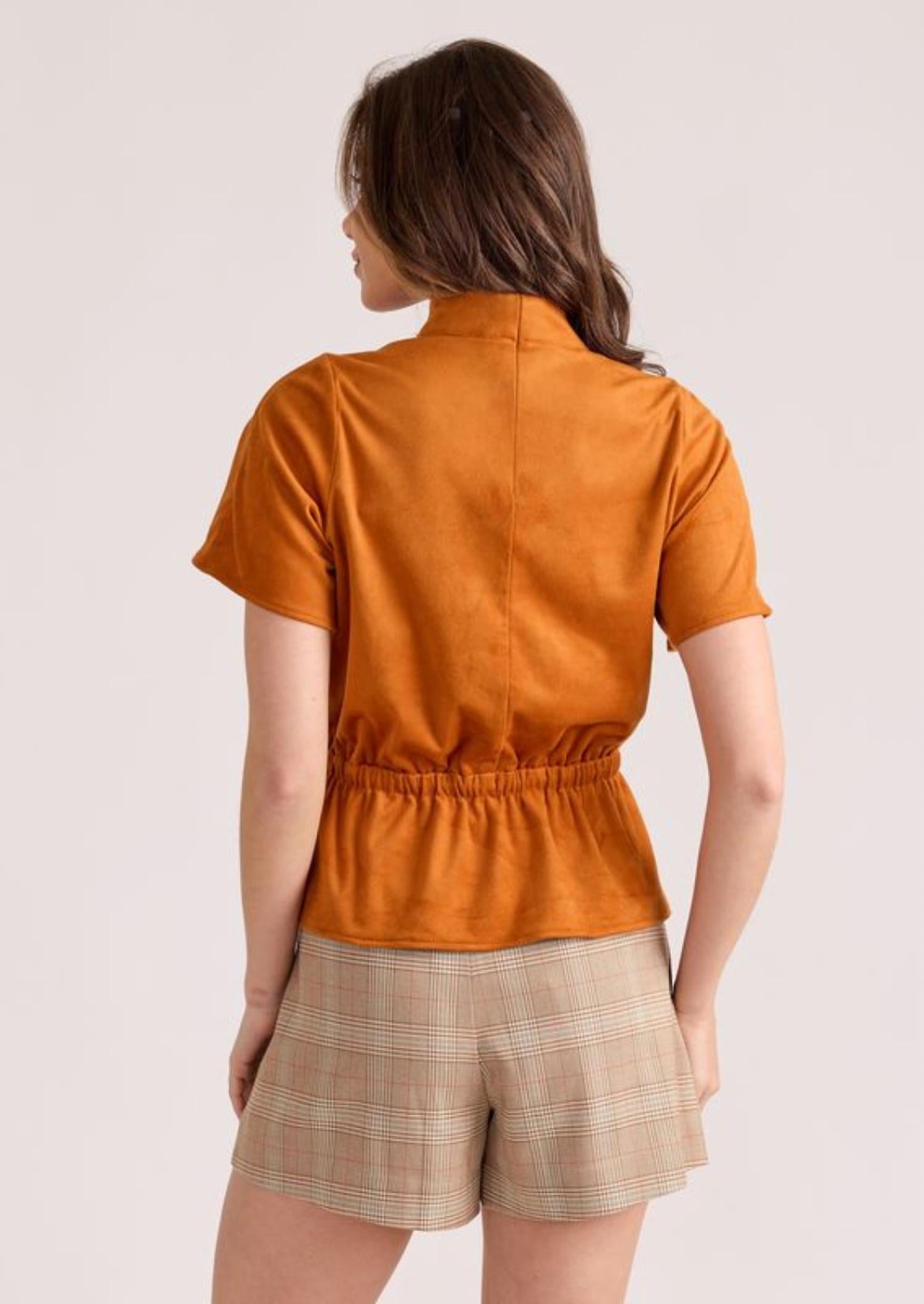 Pair this with your favorite jeans and slides for your next girls night out. Discover the Celia Top by Sedge, a minimalist piece in a captivating pumpkin hue perfect for summer vacations. This women's blouse features short sleeves and a chic turtleneck, enhancing its tailored silhouette. Crafted from polyester, it’s finished with a flattering peplum hemline and tie closure at the waist. For best care, dry clean only.
