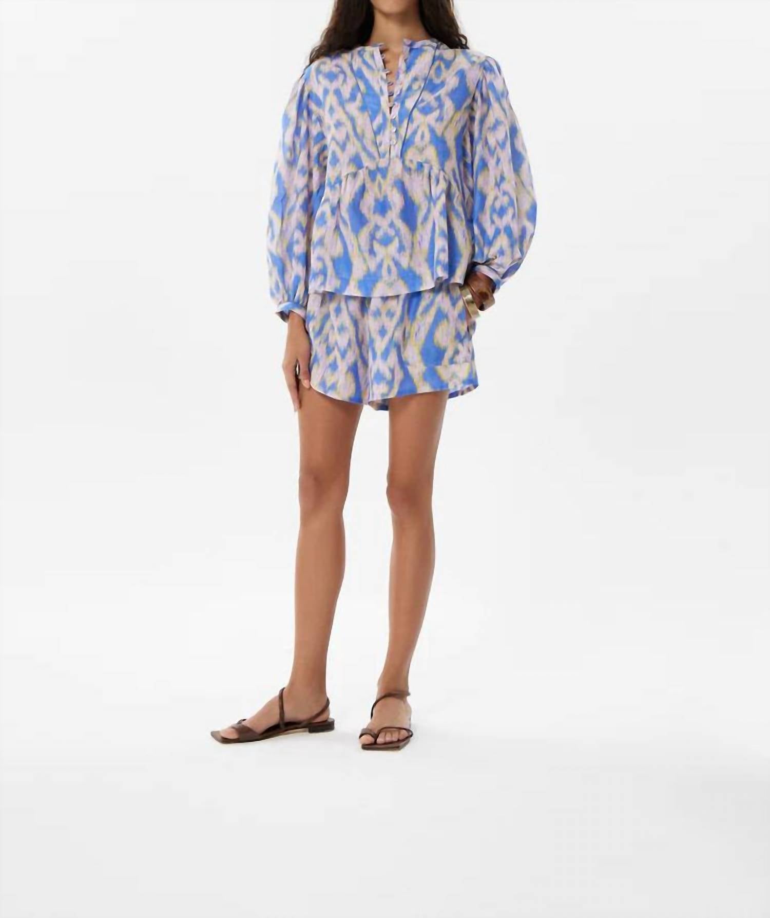 Delicate, baggy blouse. Beautifully crafted from a luxurious cotton-silk voile blend. Soft and breathable feel against the skin. Ethnic lavender hue. Designed with long, puffed sleeves and a crewneck. Exudes a romantic, bohemian flair. Front button closure enhances its graceful look. Loose fit offers comfort and ease of movement. Hand wash with cool water. Do not bleach. Soft Iron. Do not twist. Dry flat in the shade.
