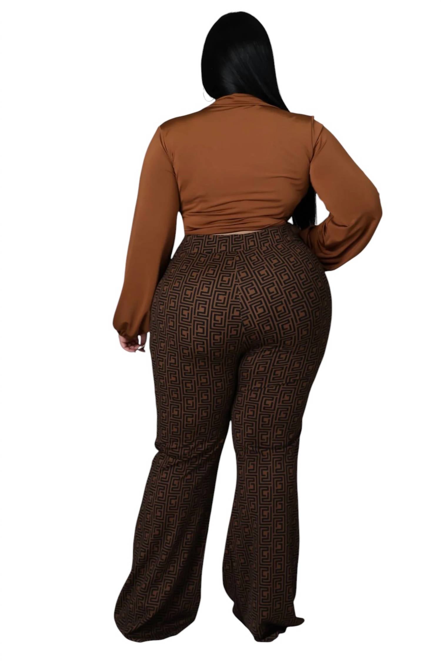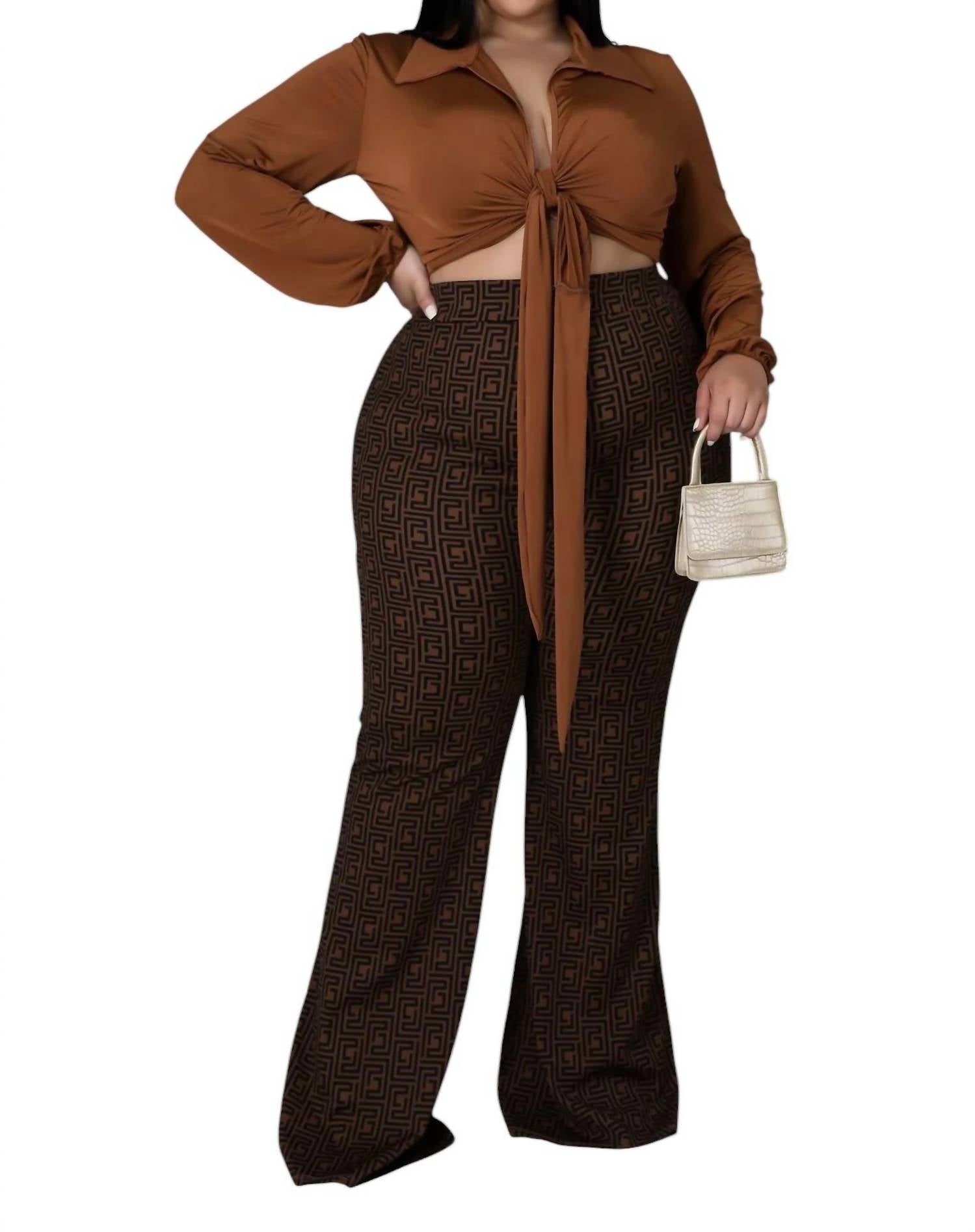 Discover effortless style with the Top and Pant Set by Good Time USA, offering a chic blend of comfort and fashion. The crop top features long sleeves and a collar, designed with a convenient tie closure, perfectly paired with high-waisted pants that have a comfortable elastic waist. The solid brown multi pattern adds a touch of sophistication to this versatile ensemble. Crafted for plus-size women, this set guarantees a flattering fit for size XXL.