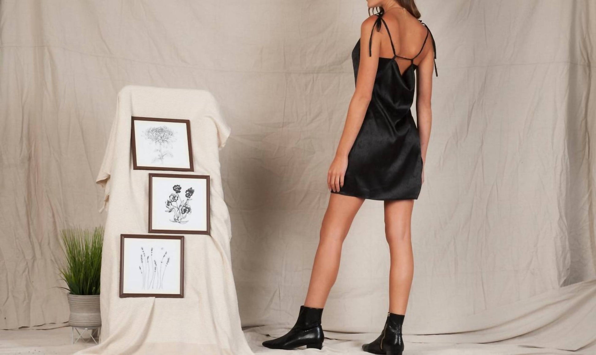 A short and breezy dress for those warmer days. Discover elegance with the LUCCA Chandon Bias Cut Mini Dress, perfect for a memorable evening event this summer. This sleeveless sheath dress in a sophisticated black hue features a chic cowlneck, self-tie straps, and a subtle zebra embossed design on luxurious satin fabric. A stylish tie closure at the back enhances the flattering drape front, with the silhouette designed as a product of the USA. Embrace the monochrome trend without pockets for a seamless, sleek profile.