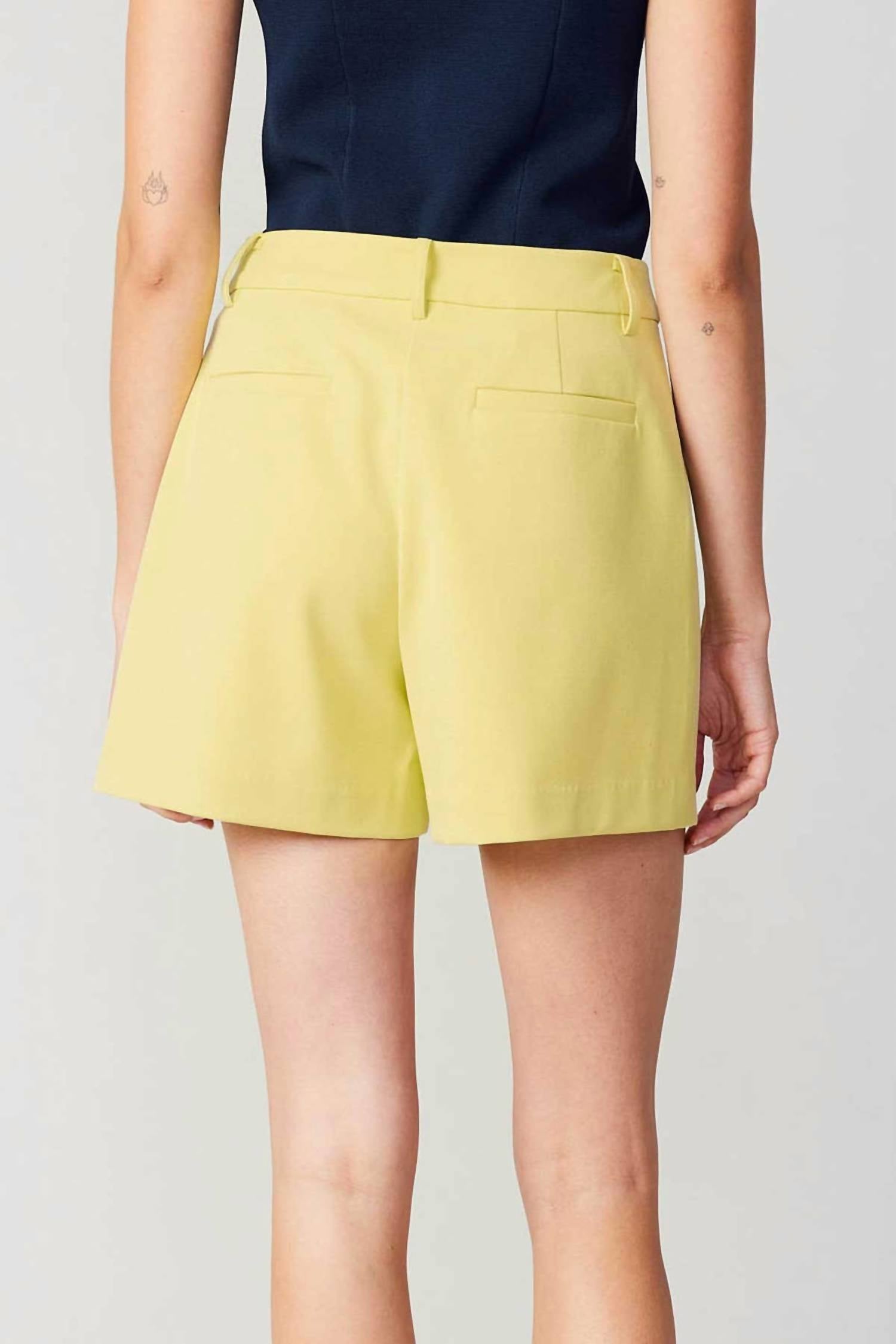 Tuck your favorite tee into these high-waist shorts for a more casual-cool feel. Introducing the Shelby Pintucked Shorts by Current Air, a chic addition to your wardrobe in vibrant Lemon Sherbet. Crafted from durable polyester, these high-waisted shorts feature a solid pattern and a hook and eye closure for a sleek finish. Designed with practicality in mind, they come with pockets for added convenience. Care for them easily with machine wash instructions.