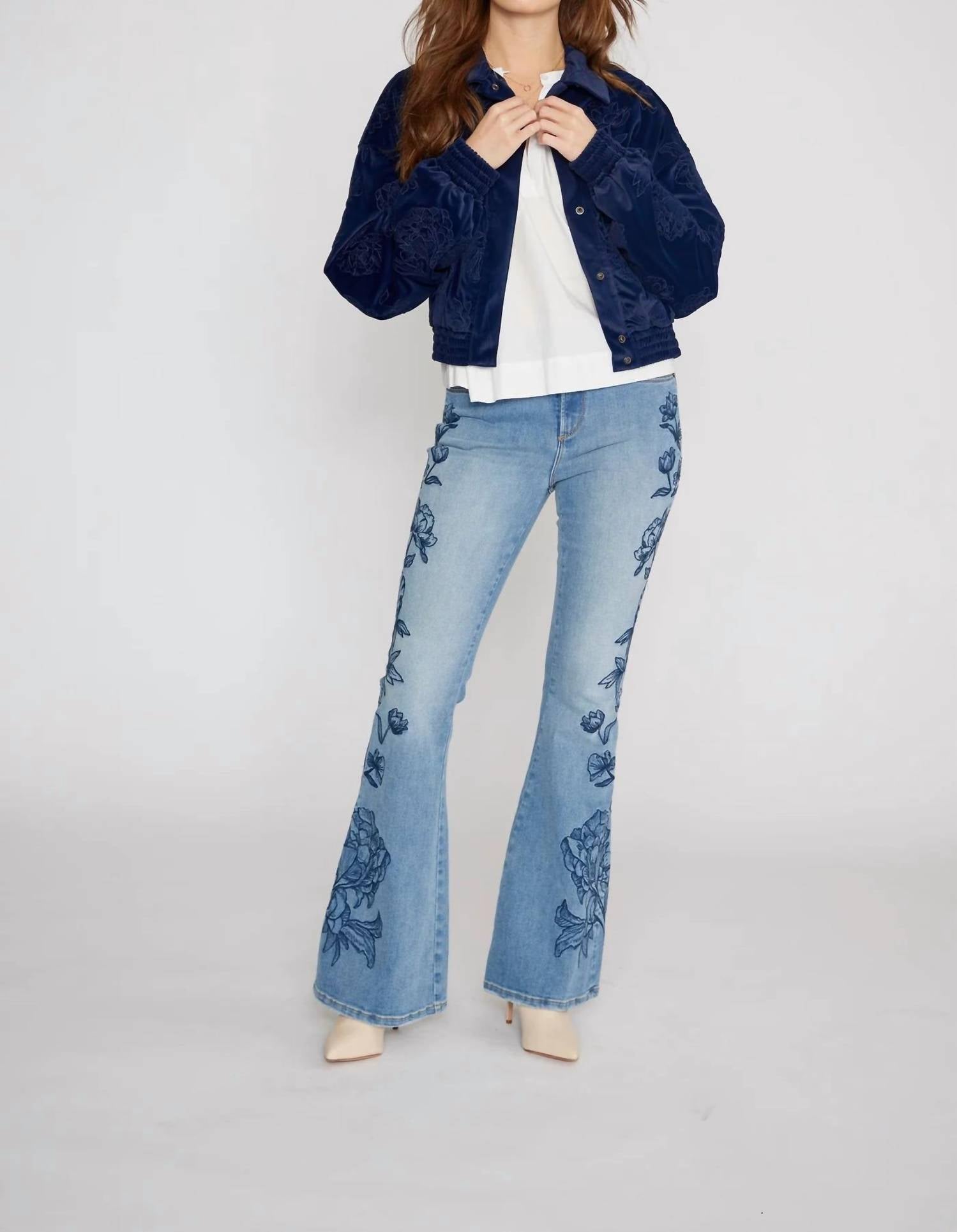 A riff on your favorite classic bomber jacket. Introducing the Detroit Velvet Bomber Etched by DRIFTWOOD, a stunning piece that effortlessly combines classic style with a feminine twist. This velvet bomber jacket features exquisite floral embroidery that pops against its solid blue color. Designed with convenience in mind, it includes pockets and features a button closure. Care is simple with machine wash and tumble dry instructions, making it as practical as it is stylish.