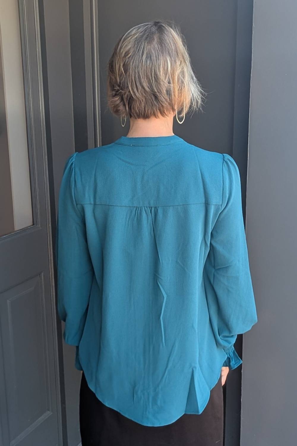 Smocked sleeves and a loose fit. V-neckline. Pleats. Curved Hem. 95%Poly 5%Spandex.