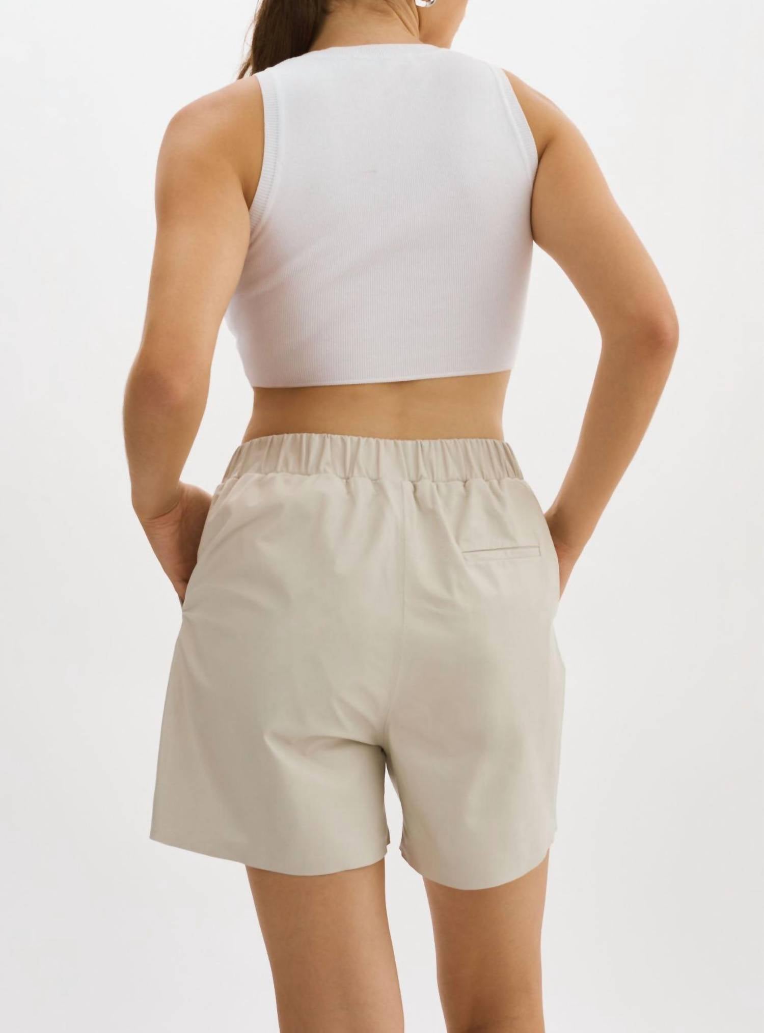 Tuck your favorite tee into these high-waist shorts for a more casual-cool feel. Elasticized waist band. Slash pockets at side. Shell: Supple, 100% Lamb Leather. Lining: 97% Polyester, 3% Spandex.