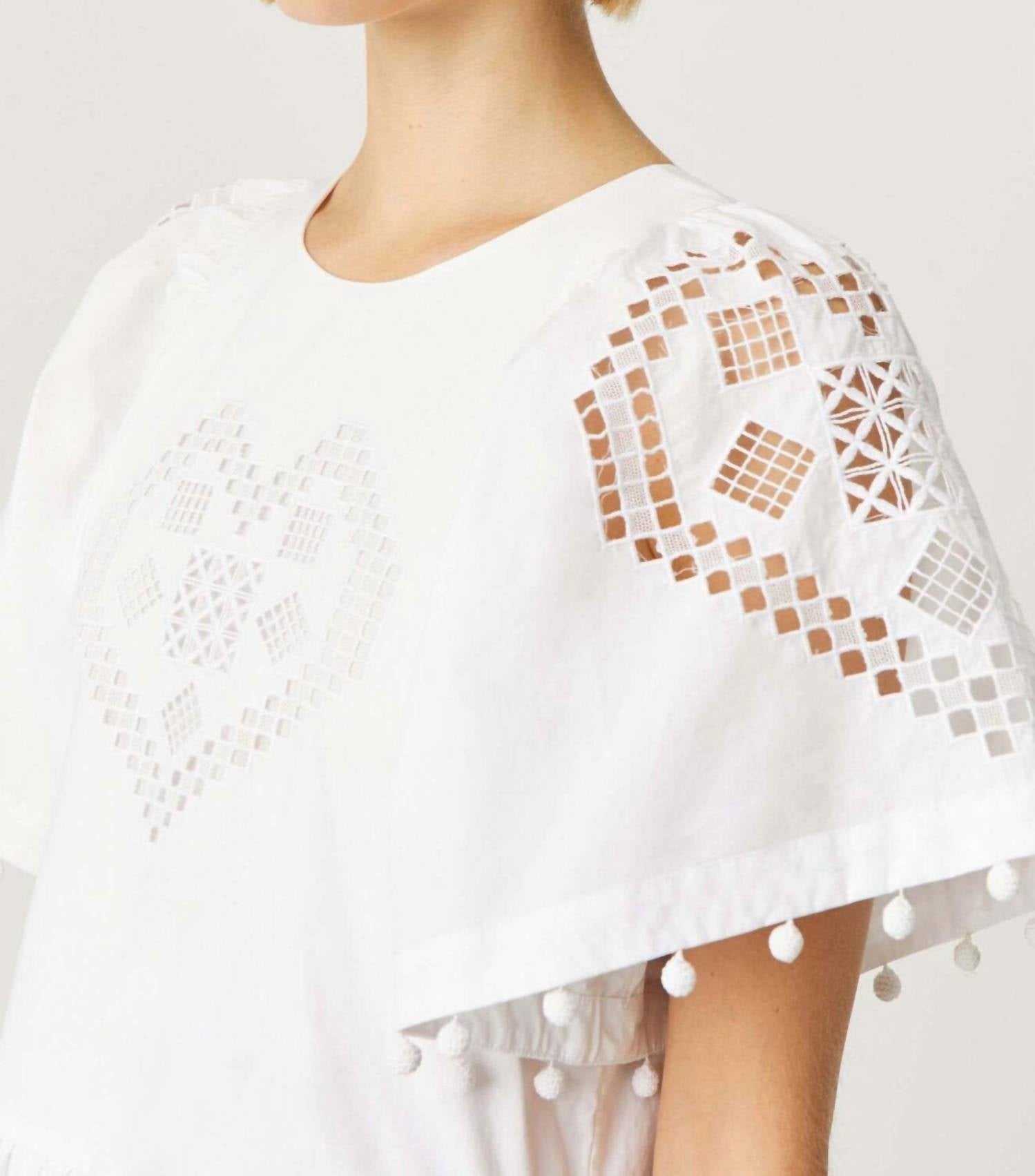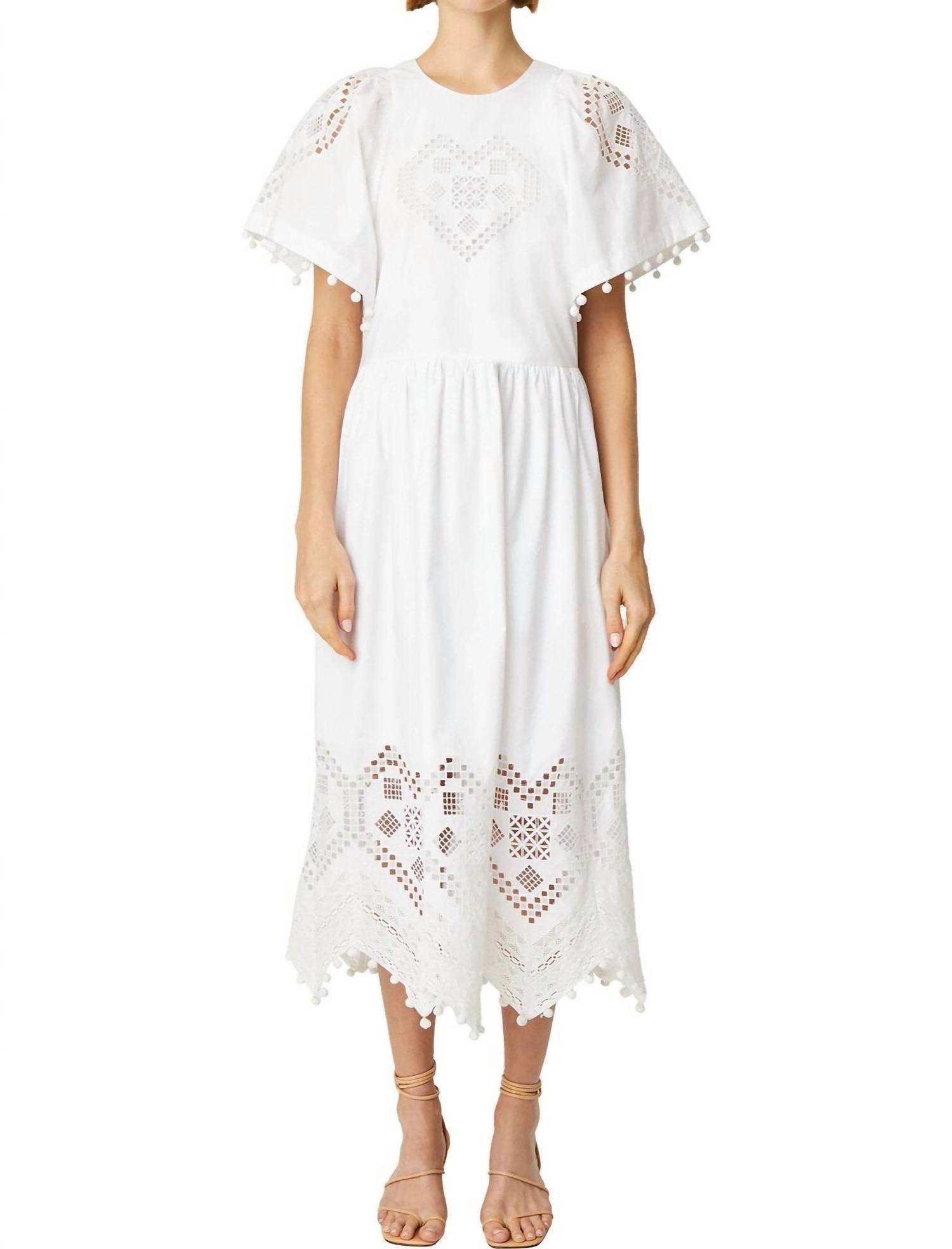 A maxi dress that is just as cute as it is comfortable. Discover the Claude Maxi Dress by RHODE, a modern take on the beloved maxi silhouette in elegant Eyelet White. This dress features short puffed sleeves with a heart-shaped eyelet design, crafted from 100% cotton with a textured pattern. Designed with an A-line silhouette and a slightly oversized fit, it adds a minimalist charm to your wardrobe. Closure: Button closure. Care: Hand wash and tumble dry.