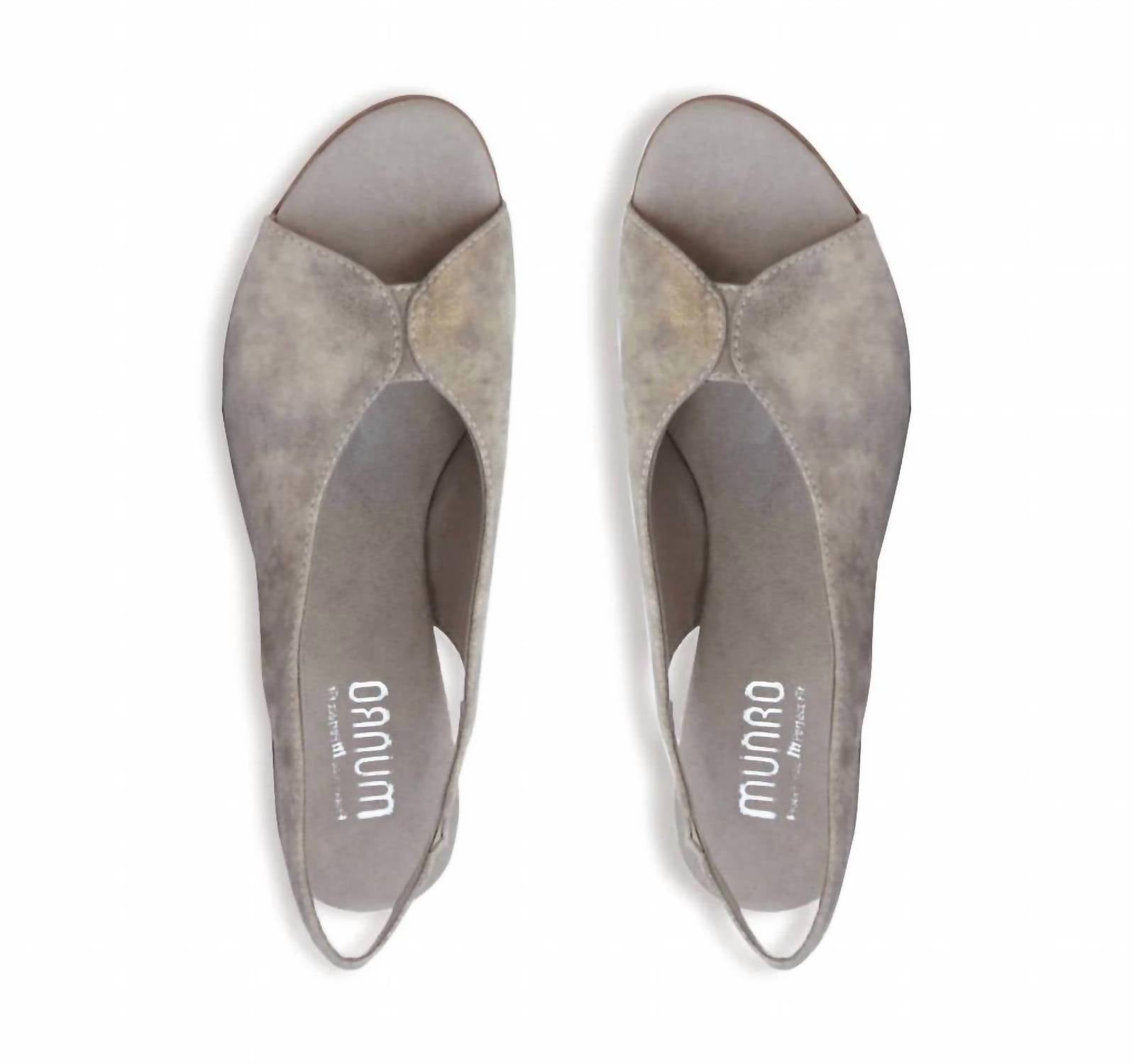Classicly cute and all-day-wearable. We love this sandal. Step into elegance with Munro's Women's Rochelle Slingback Sandal in a shimmering Gold Castoro Stardust. Designed with a 2 1/4" cone-shaped heel, this stylish sandal offers comfort with its shock absorbent and slip-resistant features. The open toe design complements its medium width fit, while a slingback strap with elastic-gore inset ensures a secure hold. Made in the USA from imported materials, this sandal boasts a leather upper, textile lining, and rubber sole, perfect for a chic evening event this spring.