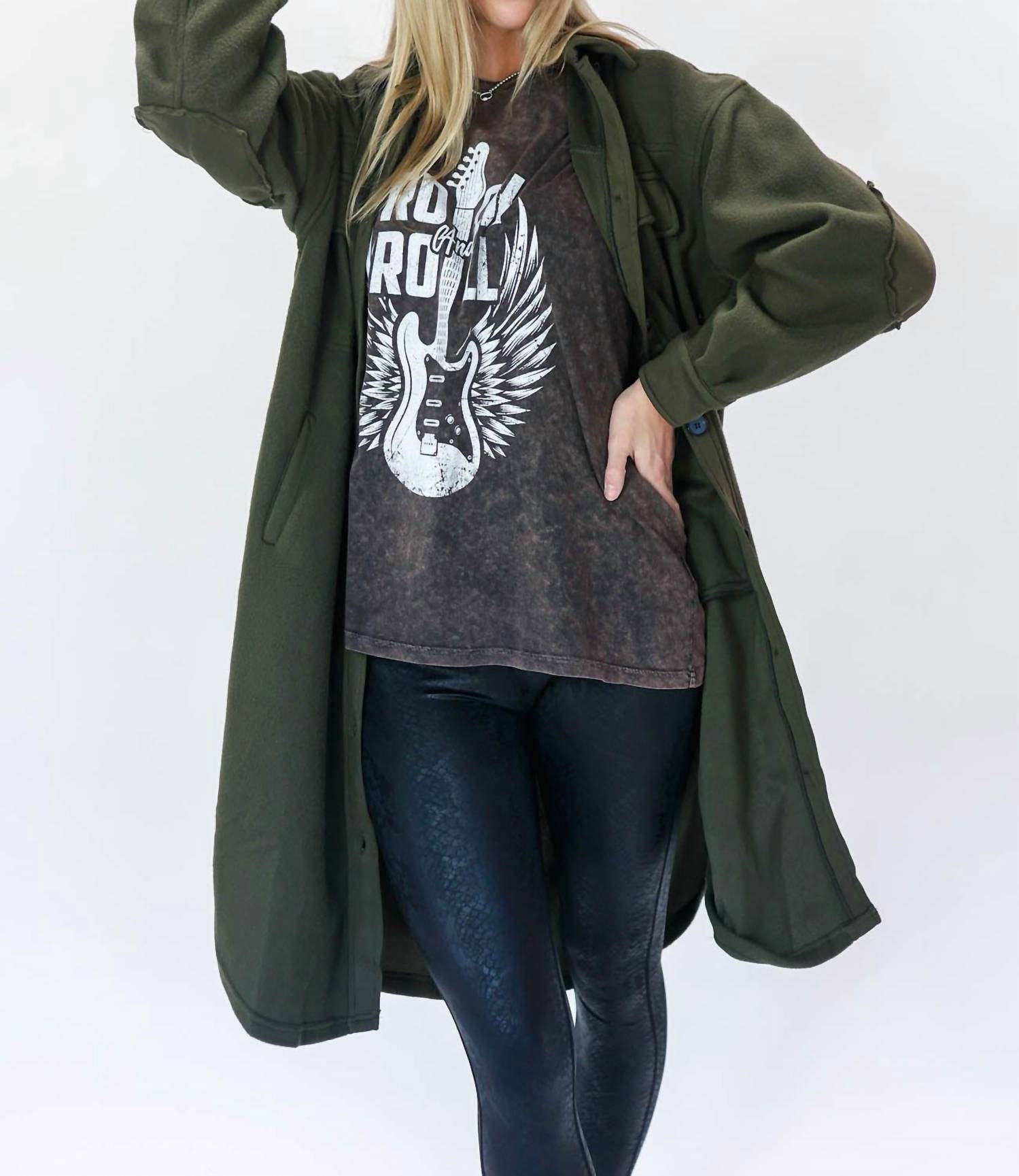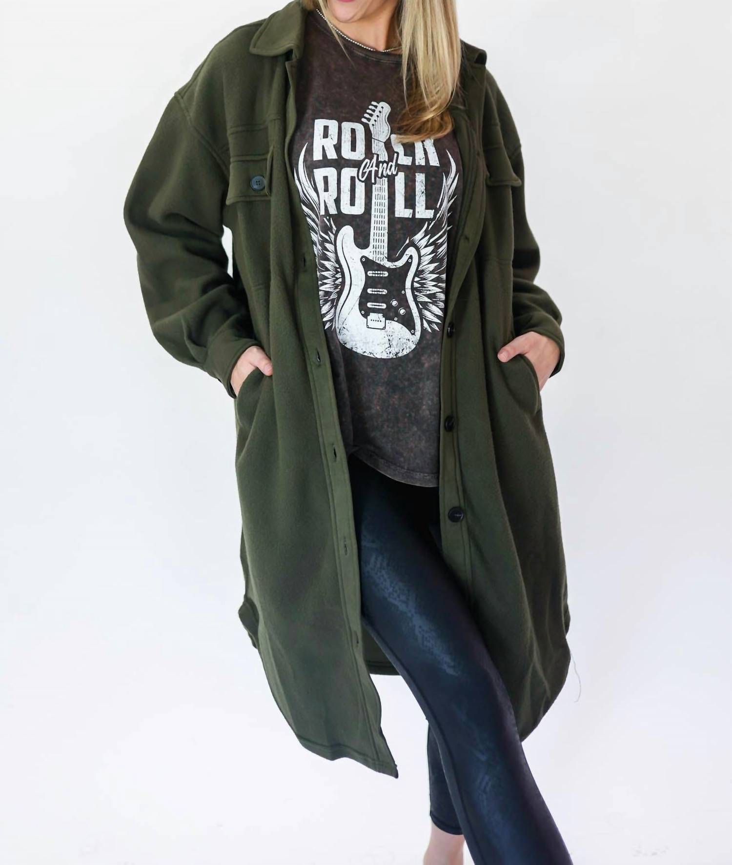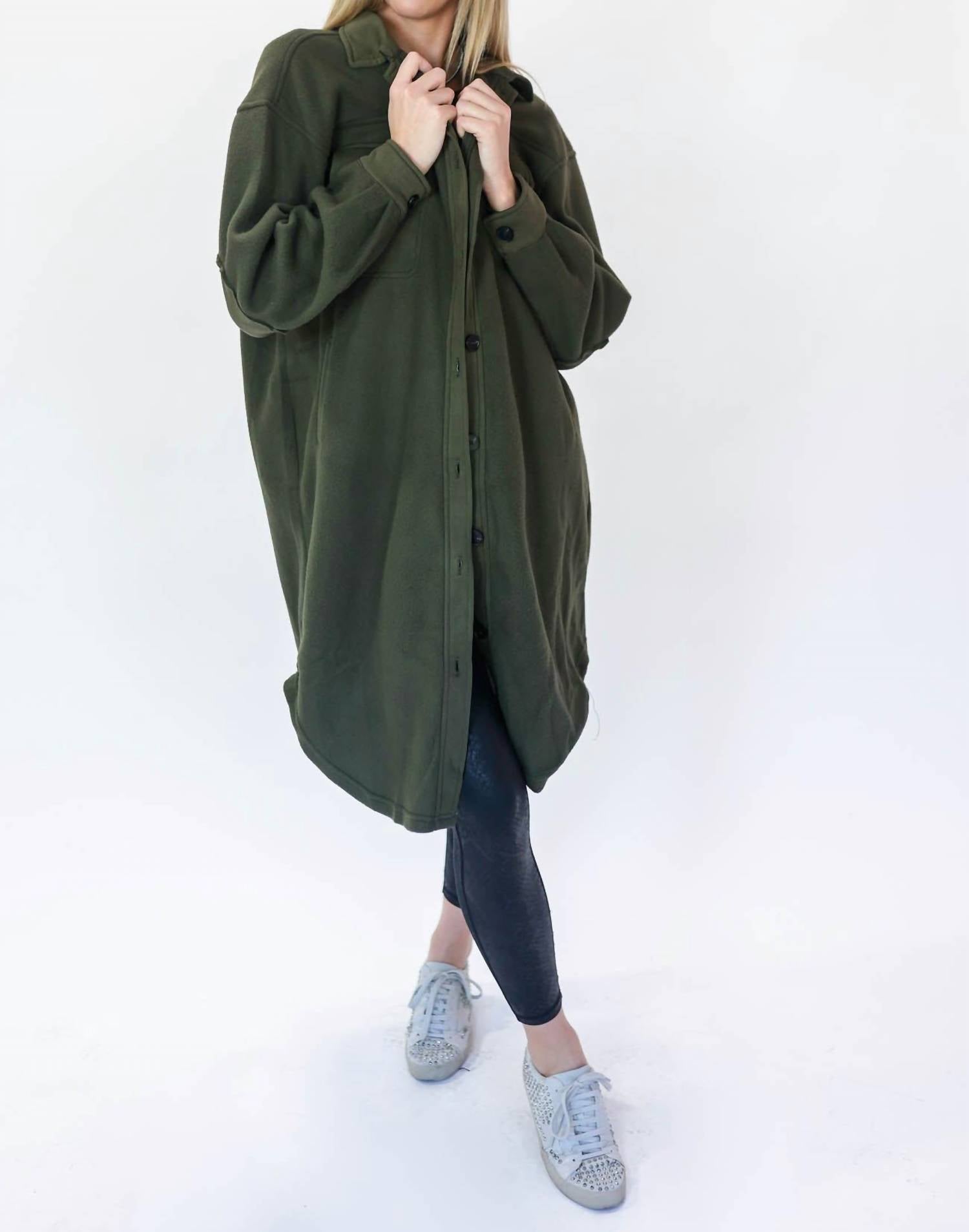 This jacket featuring soft and warm material, a button down front with a collared neckline, long loose sleeves with button closure cuffs, two side pockets and two chest pockets with flap closures, and a relaxed silhouette that falls into a rounded hemline. 100% Polyester. Model is a US size Small. Height: 5'11". Bust: 31". Waist: 26". Hips: 37".