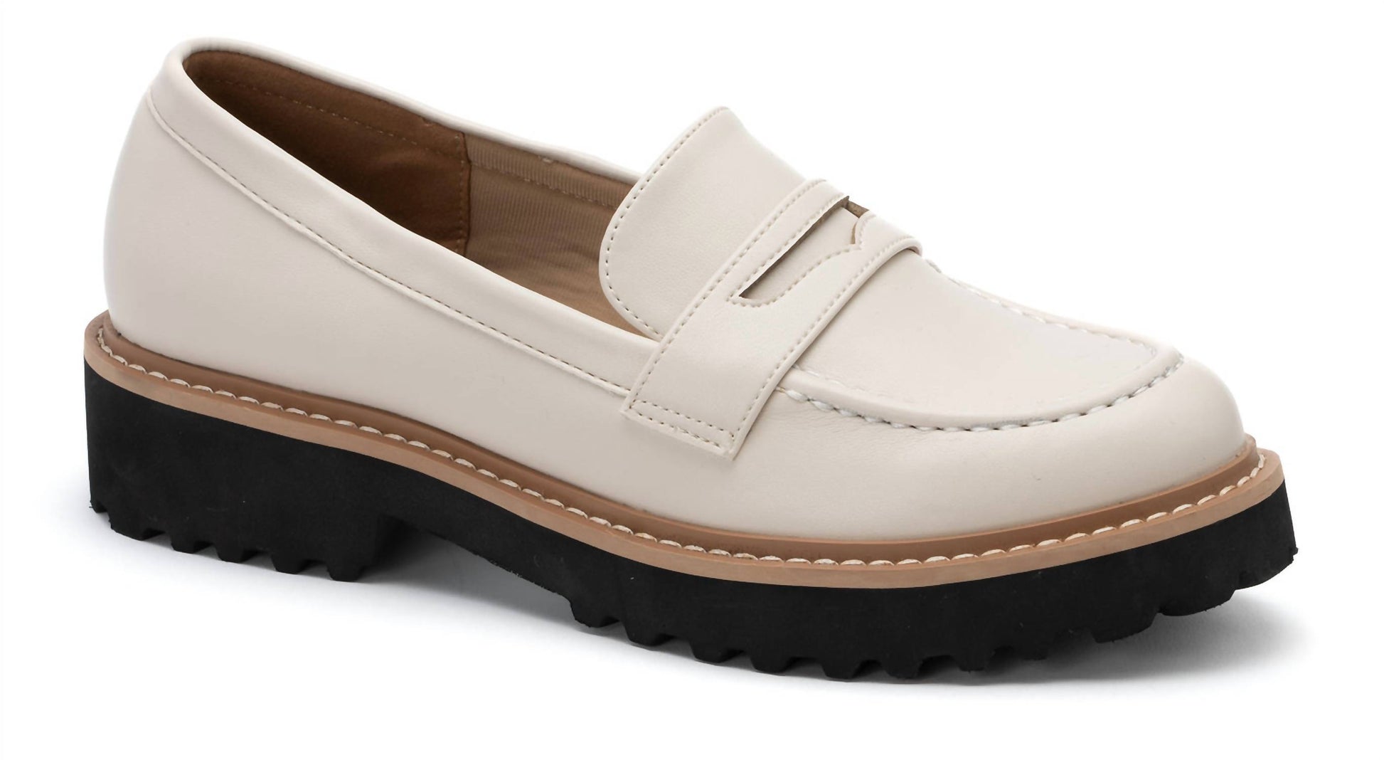 Synthetic leather upper with textile lining. Easy-on design. Almond moccasin toe with stitching details. Faux leather insole. Rubber midsole and load outsole.