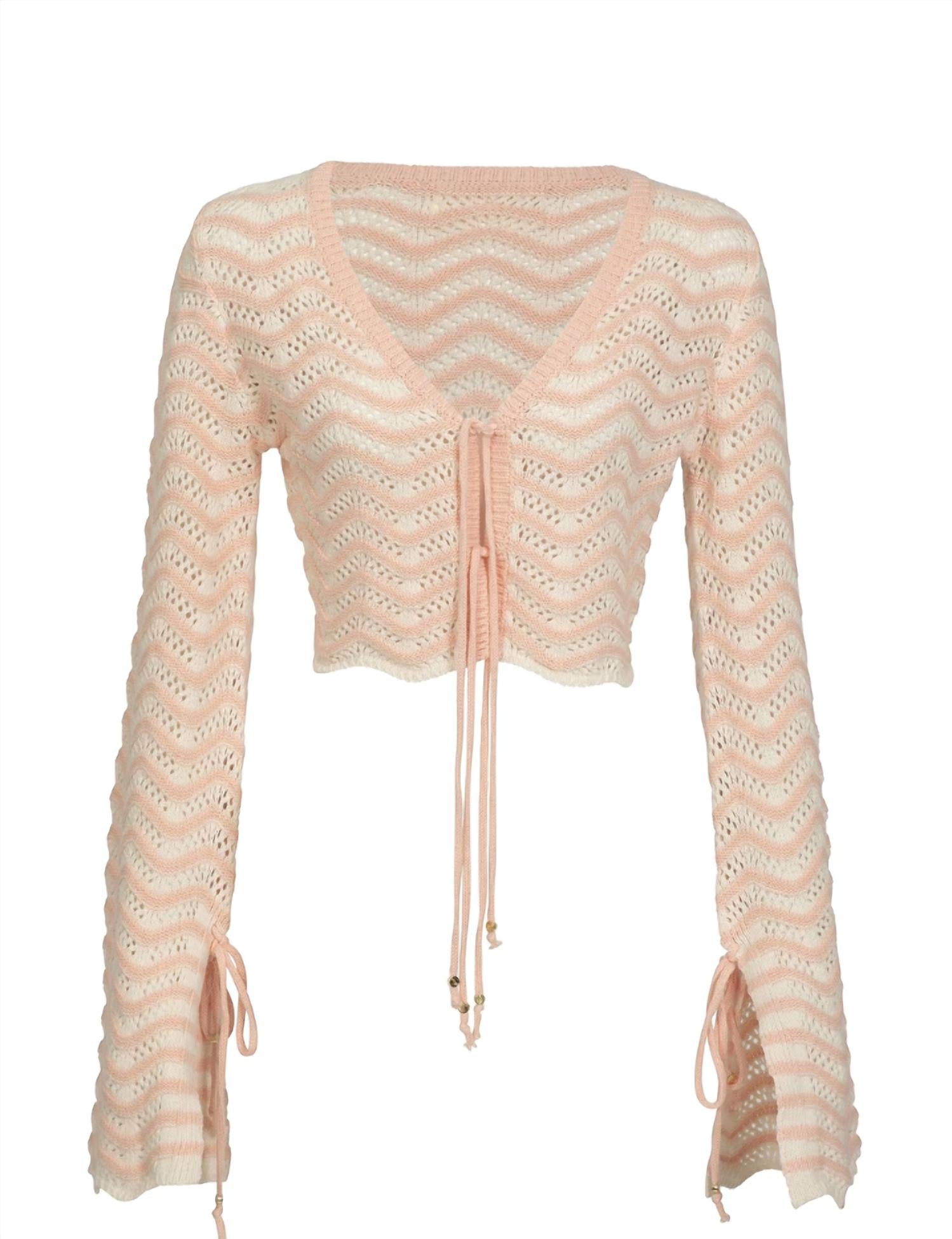 The perfect crop top for those warmer weather days. Discover the Miana Cropped Shirt by Bananhot, a chic piece perfect for your summer beach days. This cardigan boasts long sleeve bell sleeves and a playful textured pattern in knitted pink stripes, with a tie-front closure that adds elegance. Made from 83% polyester and 17% elastane, it fits with a V-neckline for a flattering look. Care: Hand wash. Model wears an XS.