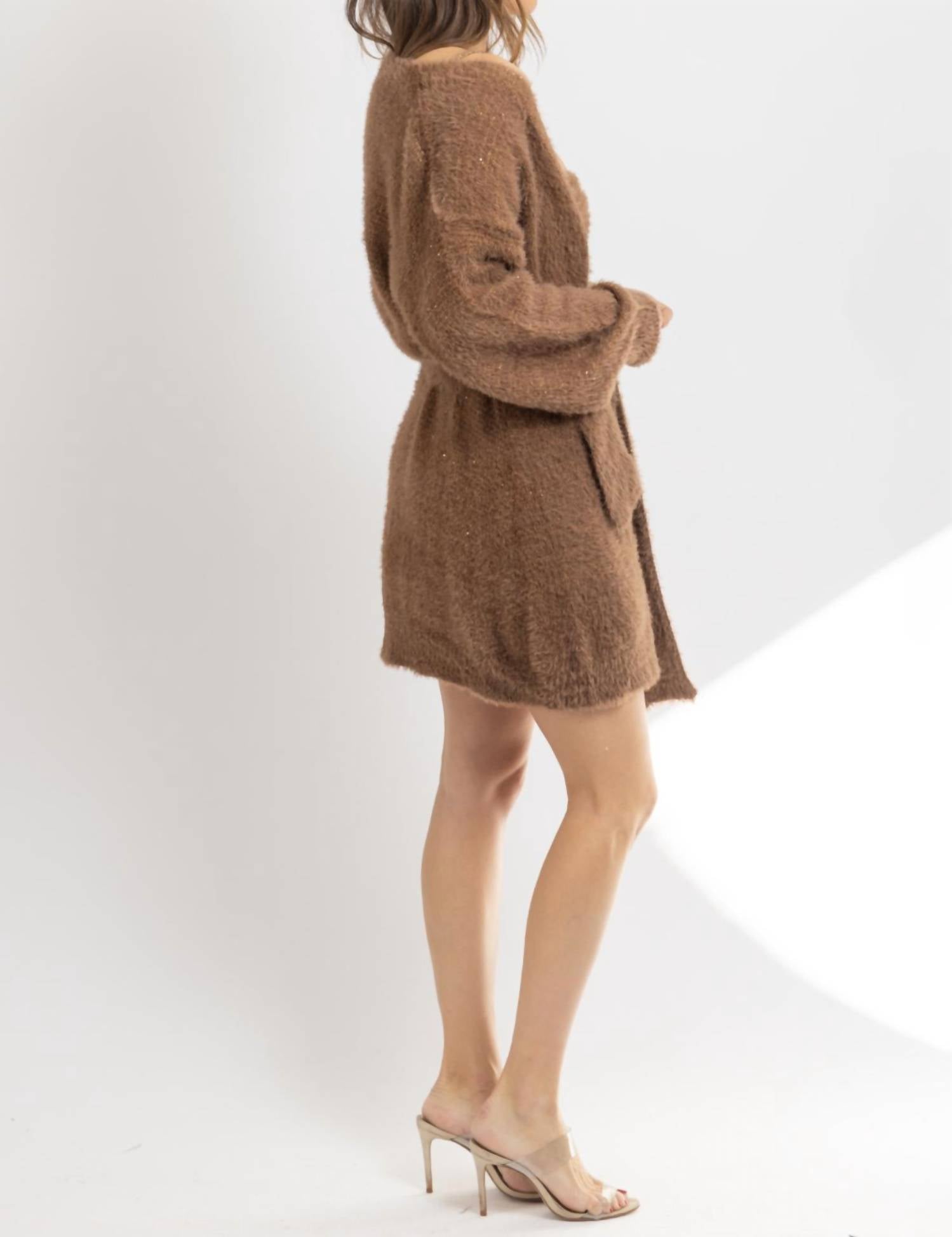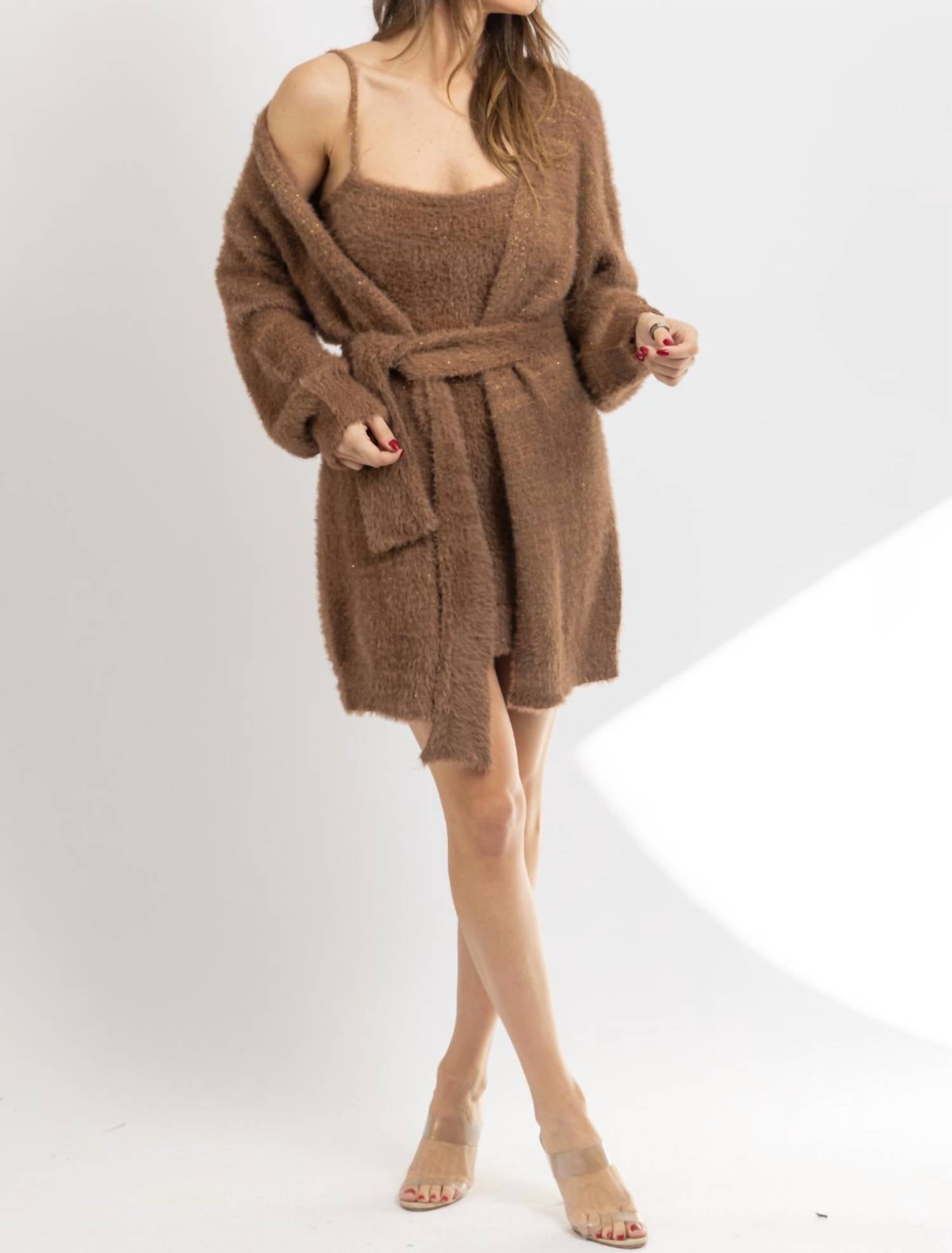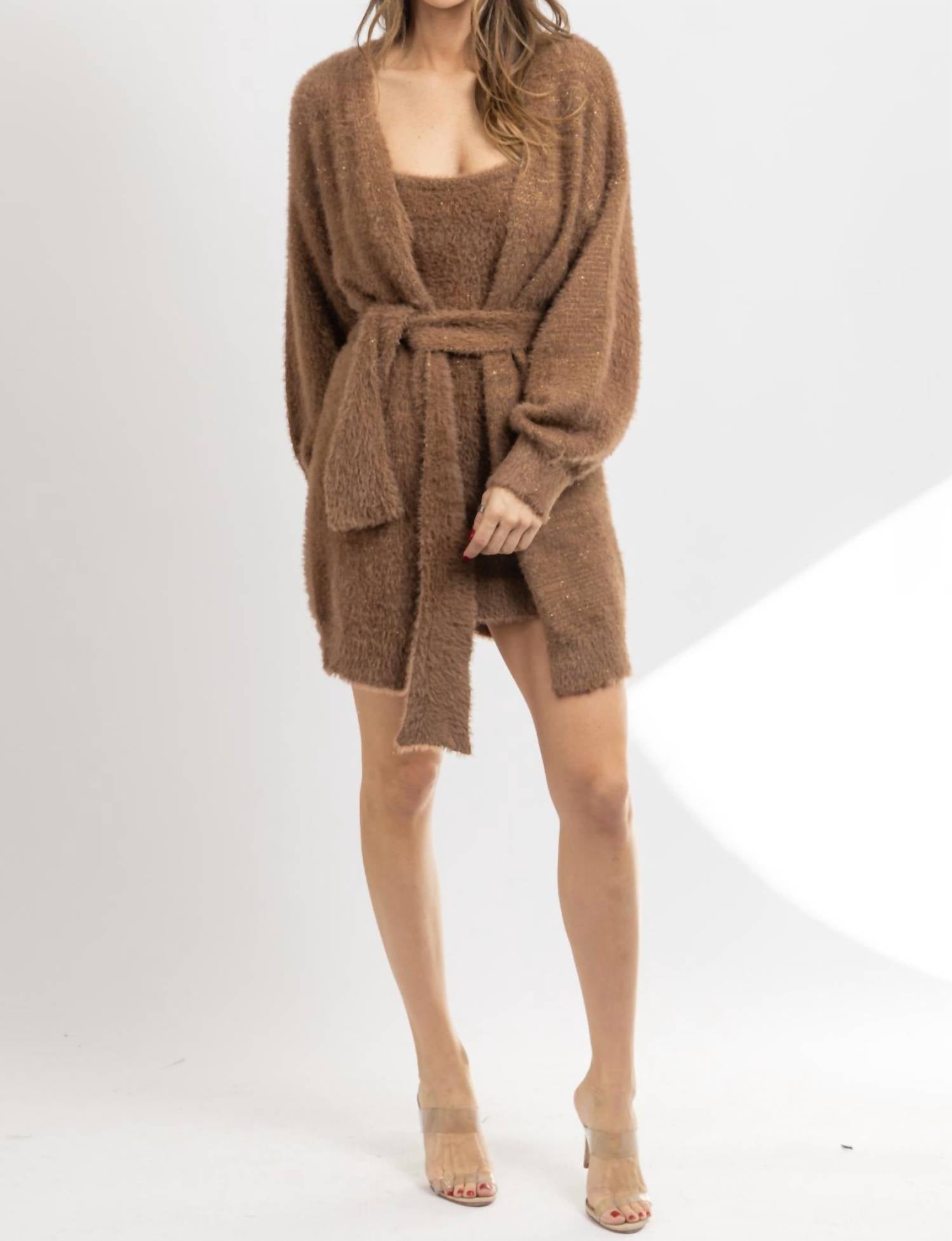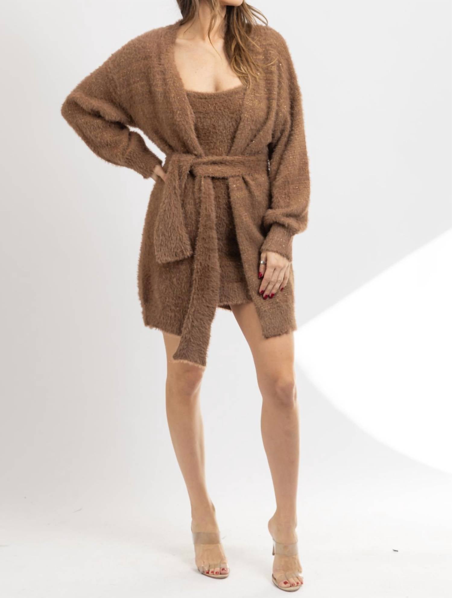The kind of easy and flattering dress you'll be reaching for all season long. Elevate your wardrobe with the Angora Mini Dress and Cardigan Set from Klesis, a chic ensemble in a warm brown hue. Featuring A cardigan with long sleeves and a dress with straps and a scoopneck, the bodycon dress silhouette provides a comfortable yet stylish fit. This set is crafted from a luxurious wool blend composed of 4% Wool, 10% Nylon, 10% Acrylic, and 76% Polyester. The cardigan's self-tie closure adds a personalized touch to your outfit, worn here by the model in a size small (5'8" height, dress size 2).