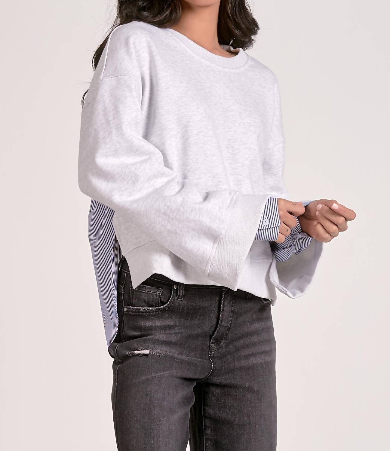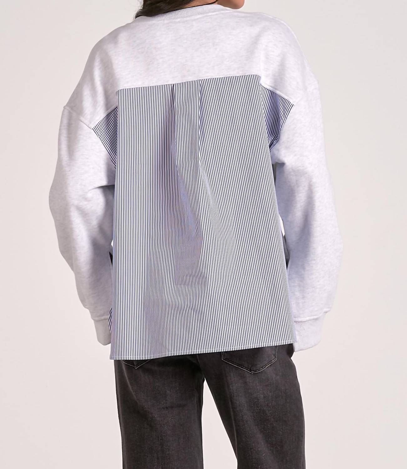 The perfect long sleeve tee that goes with just about anything. Discover the Mixed Media Top by ELAN, a playful and polished addition to your wardrobe in sophisticated grey/blue. This long sleeve tee features a unique combination of a soft heather knit front with a crisp striped woven back and cuffs, perfect for adding dimension to any outfit. Crafted from comfortable cotton, this summer staple offers a crewneck and relaxed fit with a convenient pull-on closure. Care: Hand wash and line dry. Ideal for back-to-school or trendy workwear occasions.