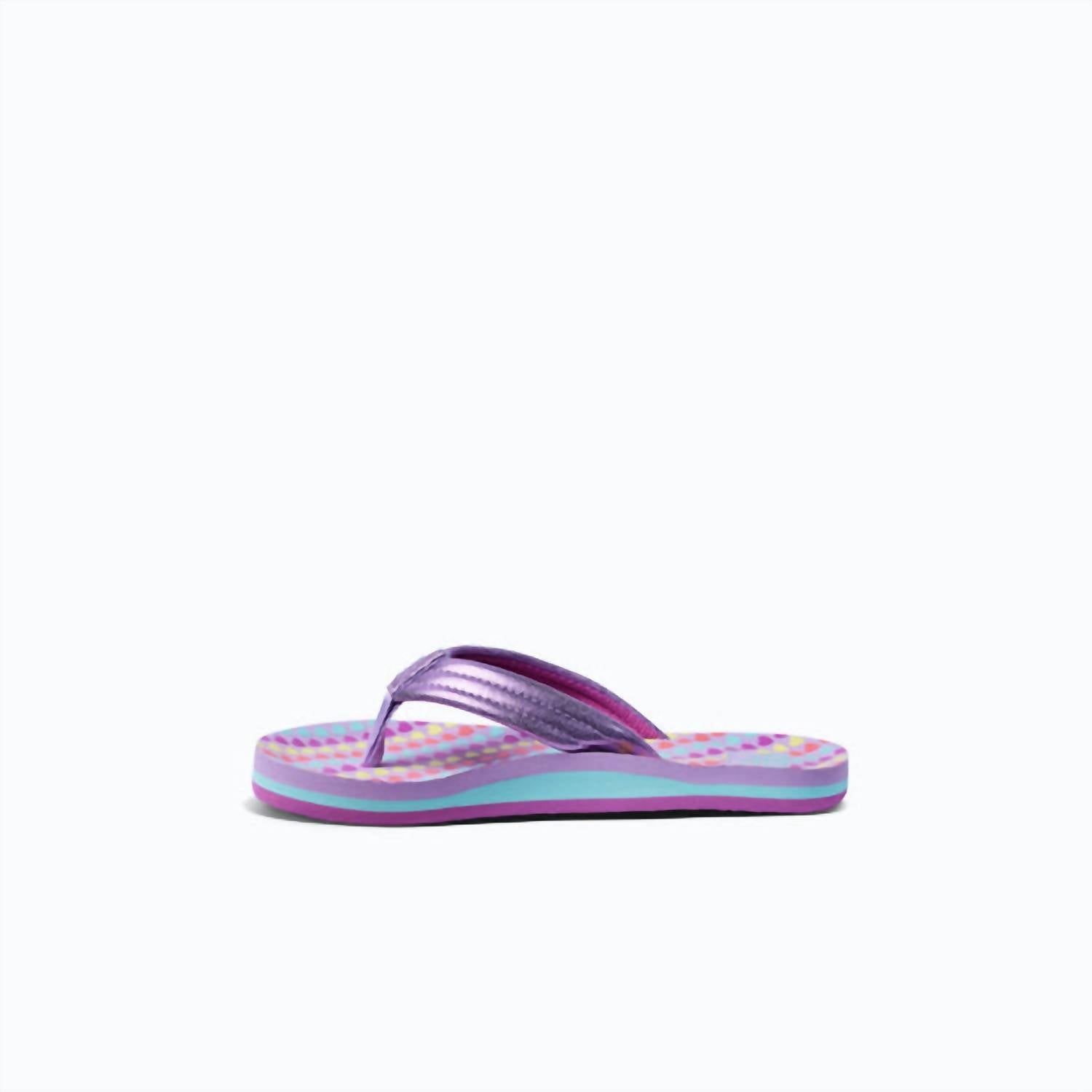 Introducing the Girl's Ahi Sandal by REEF, a perfect choice for toddlers ready to embrace sunny days with ease. These Lavender Multi sandals feature a synthetic strap with webbing lining for extra comfort, along with a printed EVA footbed and high-density EVA outsole for durability. Ideal for a beach day, these open-toe sandals boast a flat heel under 1", making them an excellent summer essential for any little girl on the move. Designed without closures and crafted for easy wear, they invite endless summer adventures.
