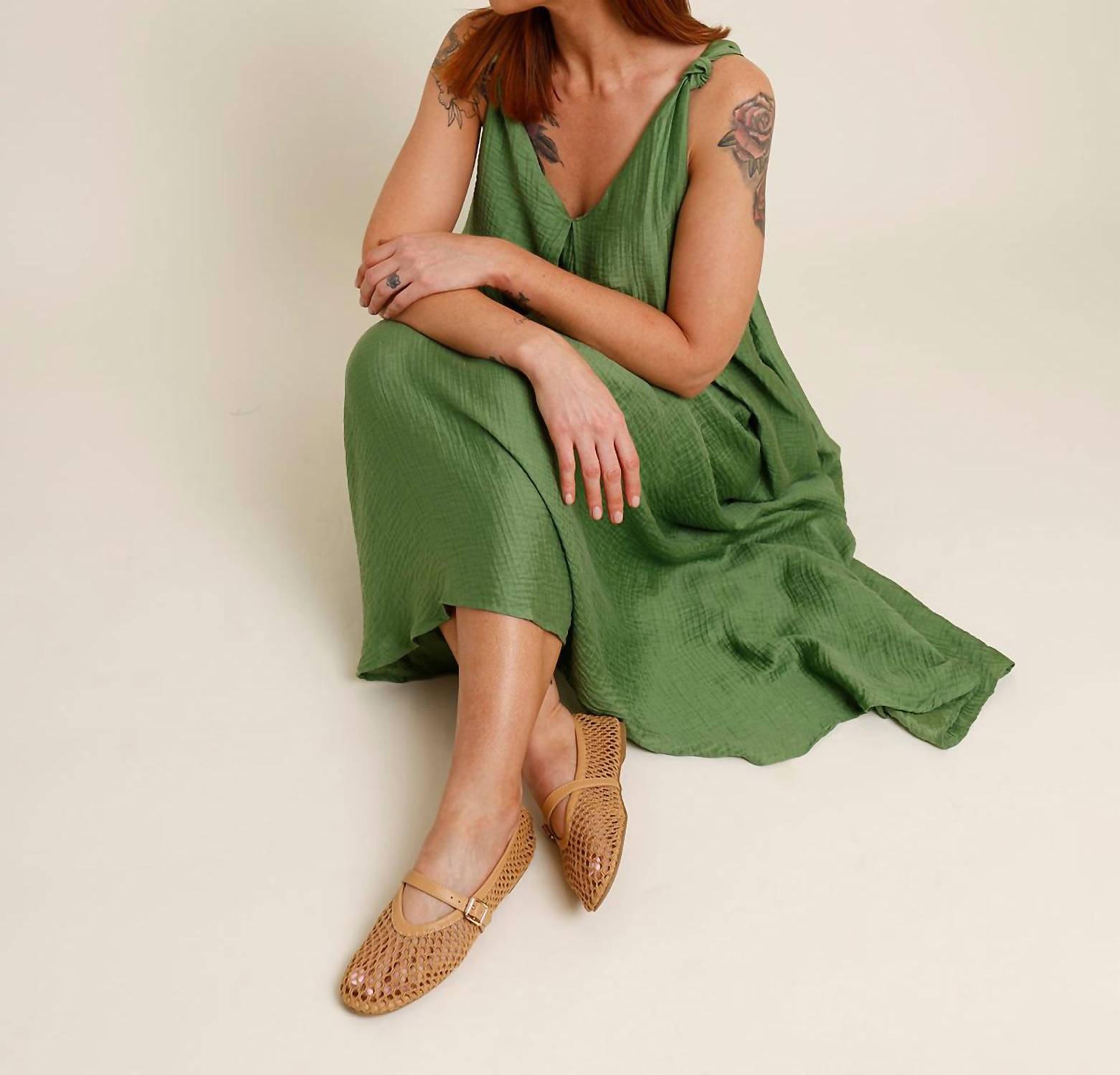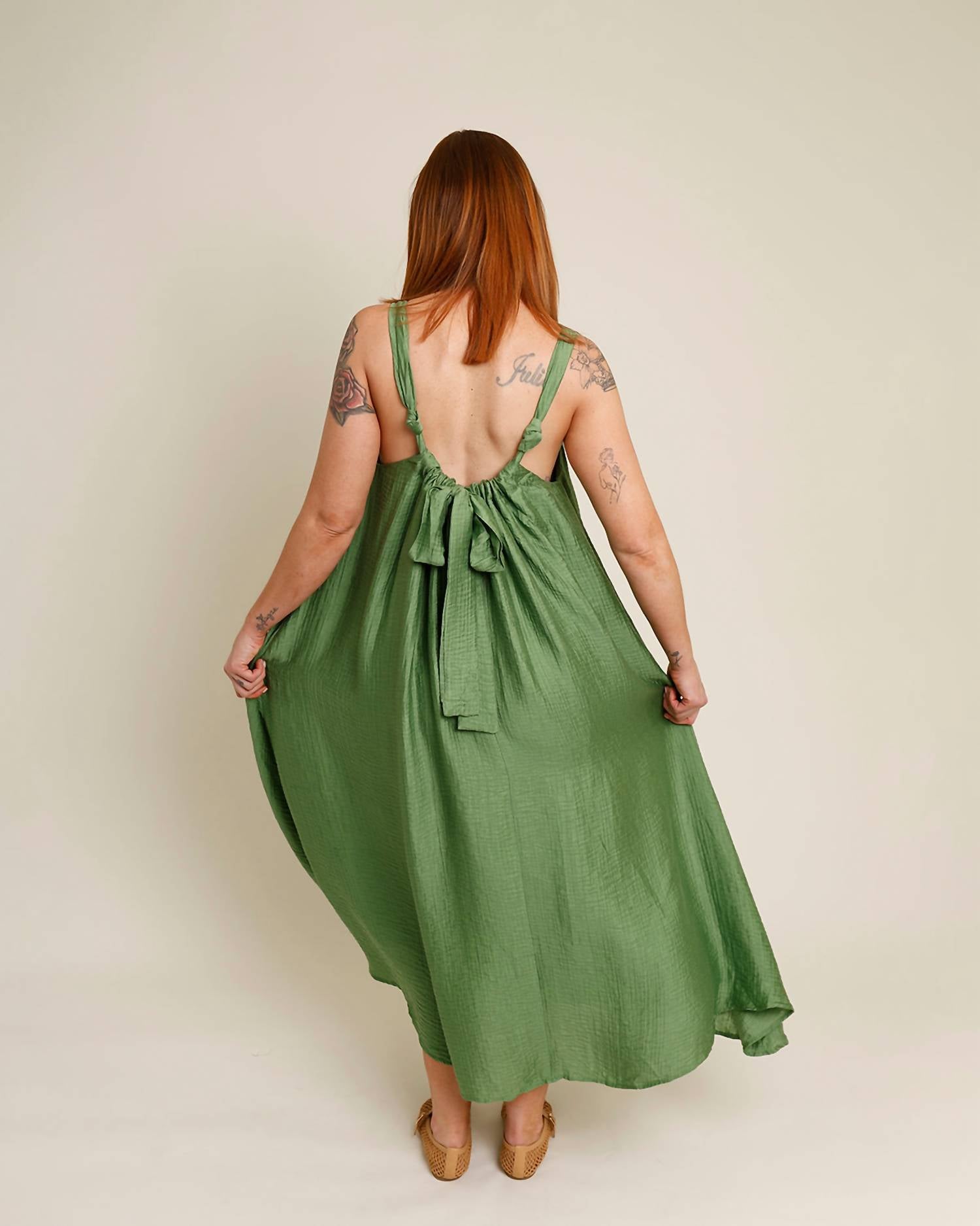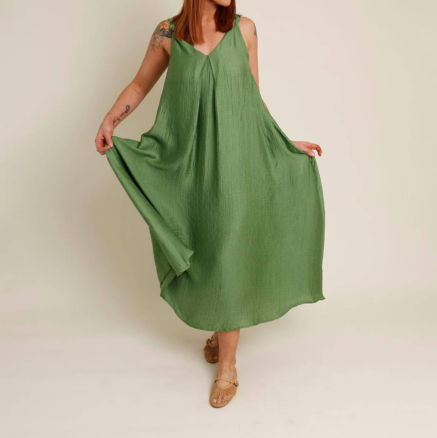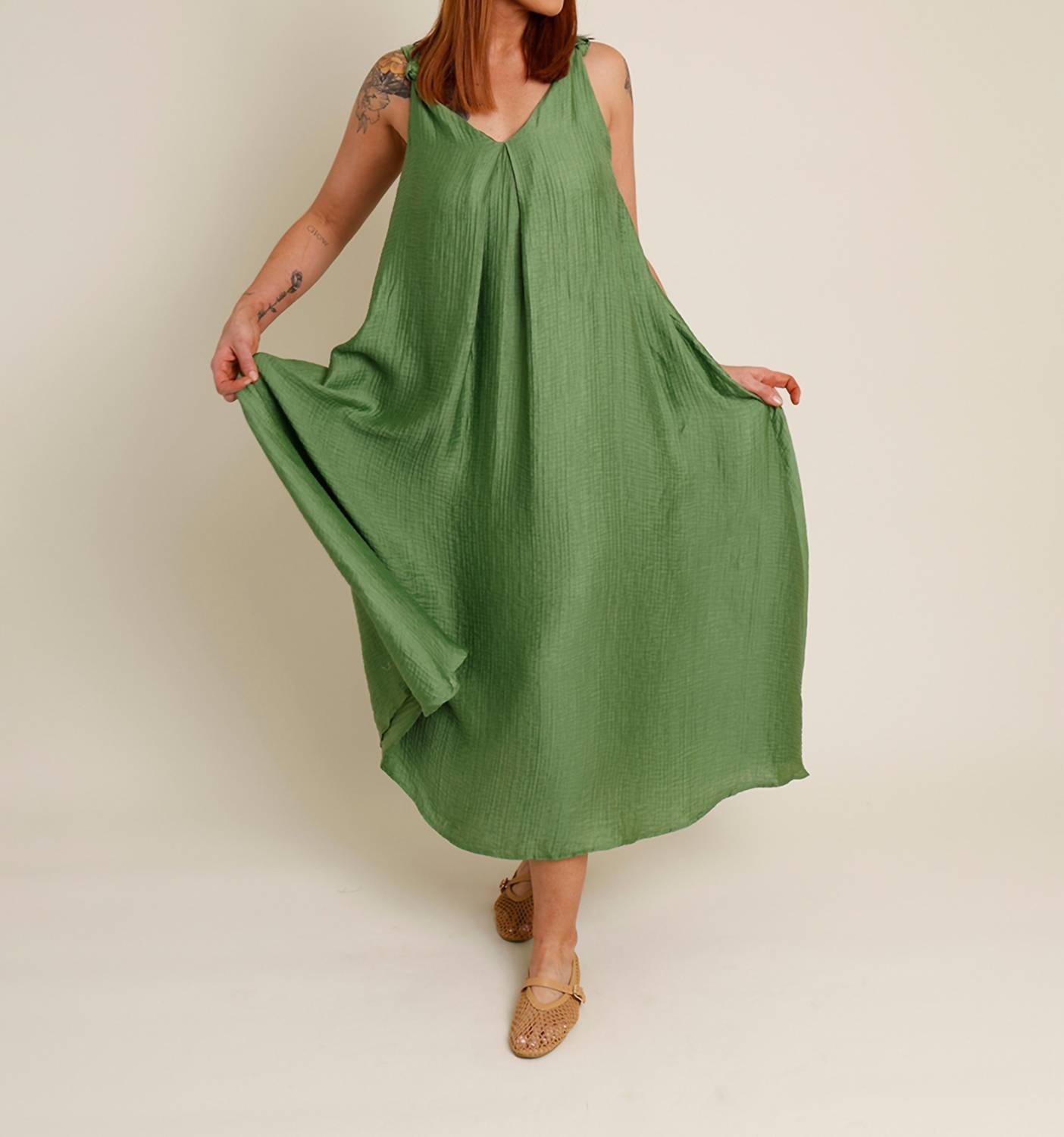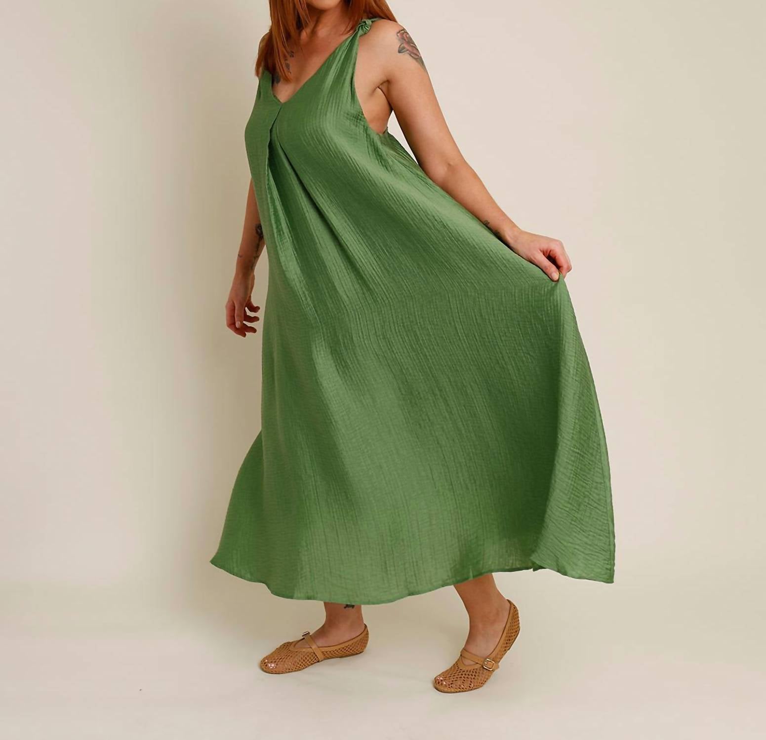Style this maxi with your favorite statement necklace and sandals for the perfect look. Introducing the Lauria Twist Strap Textured Maxi Dress by FRNCH, a stunning summer essential in a vibrant green hue. This sleeveless dress boasts a chic v-neck and features an elegant inverted front pleat detail with adjustable back tie closure for a perfect fit. Crafted from a luxurious viscose blend with a 100% viscose lining, this shift silhouette maxi dress elevates your warm-weather wardrobe with comfort and style. Care: Hand wash only and wash with similar colors. Model is 5'10", with a 36" chest, 27" waist, 43" hip and is wearing a size medium.