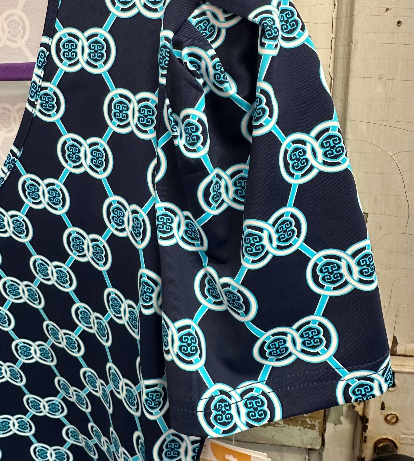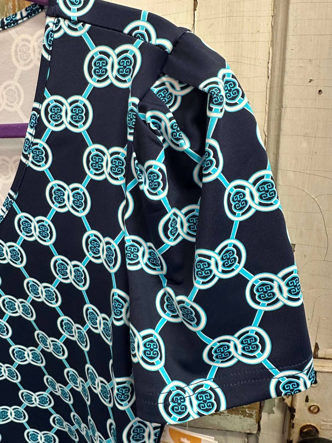 A short and breezy dress for those warmer days. Elevate your wardrobe with the Gathered Short Sleeve Dress by Lulu-B in a mesmerizing midnight blue and teal geometric pattern. Crafted from a nylon blend, this mini A-line dress features short sleeves and a V-neckline, providing not only style but also a cooling effect and UPF50+ protection. This women's dress offers unparalleled comfort without a closure, making it easy to wear on any occasion. Care instructions are not provided.
