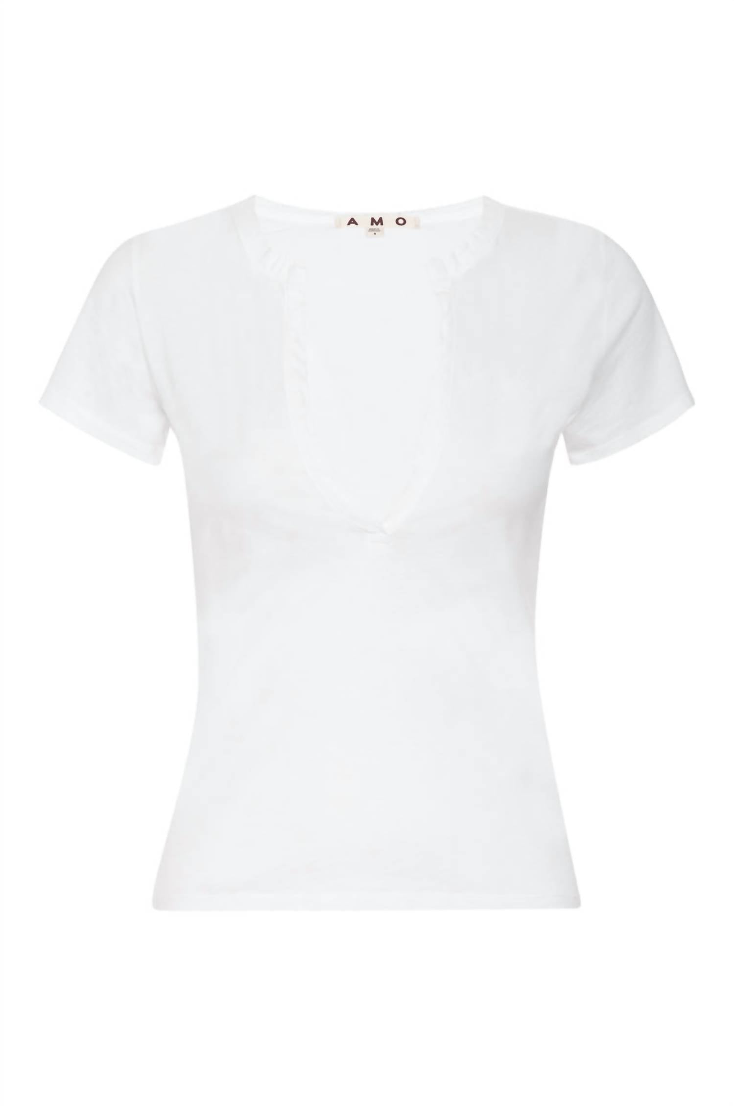 Look no further, you just found your perfect tee! The Women's Delightful Tee by AMO in Neptune is your go-to choice for a chic summer look. This short-sleeve tee, made from 100% cotton, offers a stylish fit with a deep notched V-neckline. Crafted in Portugal, it measures 23" in length and 34" across the chest, fitting true to size. For effortless care, simply machine wash it cold.