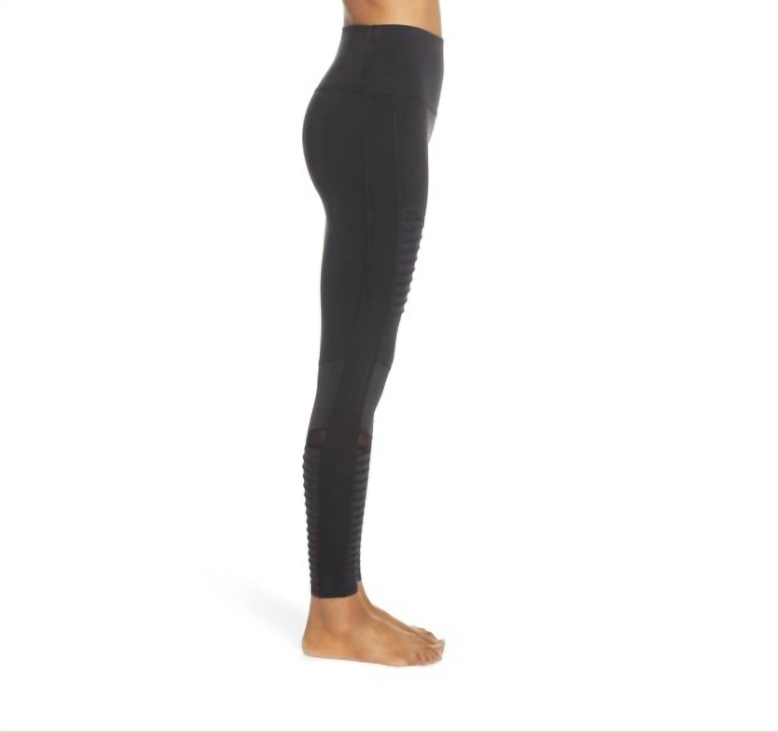 Elevate your activewear collection with the High Waisted Moto Leggings by ALO YOGA. These women's leggings boast a chic moto aesthetic, featuring pintucked panels and a seamless, figure-flattering design. Crafted from a durable 87% Nylon and 13% Spandex blend, they ensure comfort with a wide elastic waistband and smooth flatlock seaming. High-rise with an inseam of 24.5", a front rise of 9.25", and a leg opening of 8.5" at the hip, these black leggings are pull-on style, offering a sleek and stylish skinny leg silhouette. Hand wash and dry flat to maintain their perfect fit.